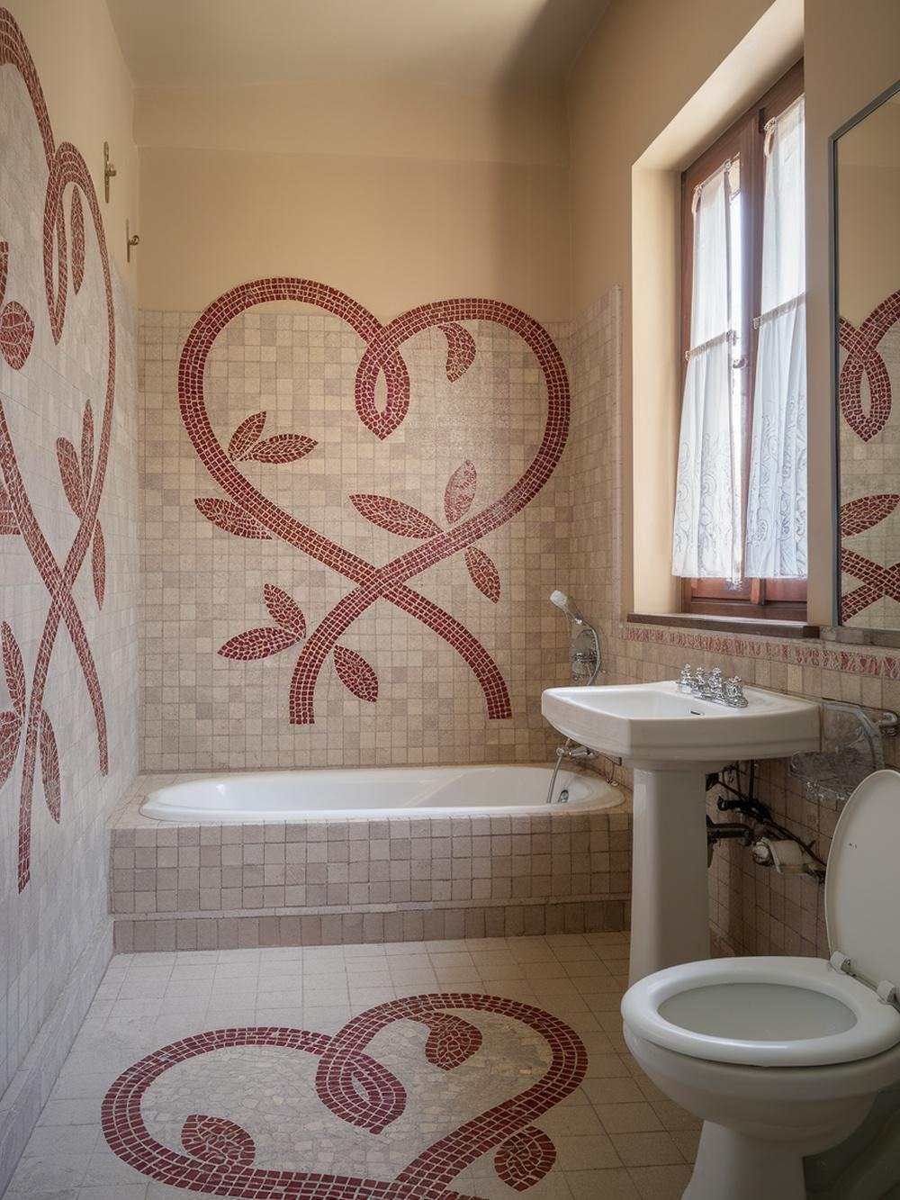 Red mosaics can add a unique flair to any bathroom, and this image showcases just how stunning they can be. The heart-shaped patterns made from small tiles create a warm and inviting atmosphere. The intricate design draws the eye and adds a touch of artistry to the space. The combination of red and neutral tones works beautifully together. It’s a great way to incorporate a bold color without overwhelming the room. The playful leaf motifs intertwined with the hearts add a whimsical touch, making the bathroom feel more personal and cozy.