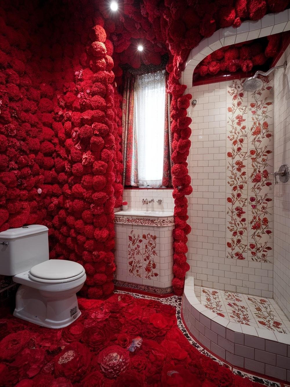 Red floral decor can transform a bathroom into a vibrant and inviting space. This image showcases a stunning example where the walls are adorned with lush red flowers, creating a striking visual impact. The bold color choice makes the bathroom feel lively and energetic. The floral theme continues with decorative elements like the patterned tiles and the floral shower area. This cohesive design ties everything together, making the space feel harmonious. The natural light filtering through the window adds warmth, enhancing the overall atmosphere.