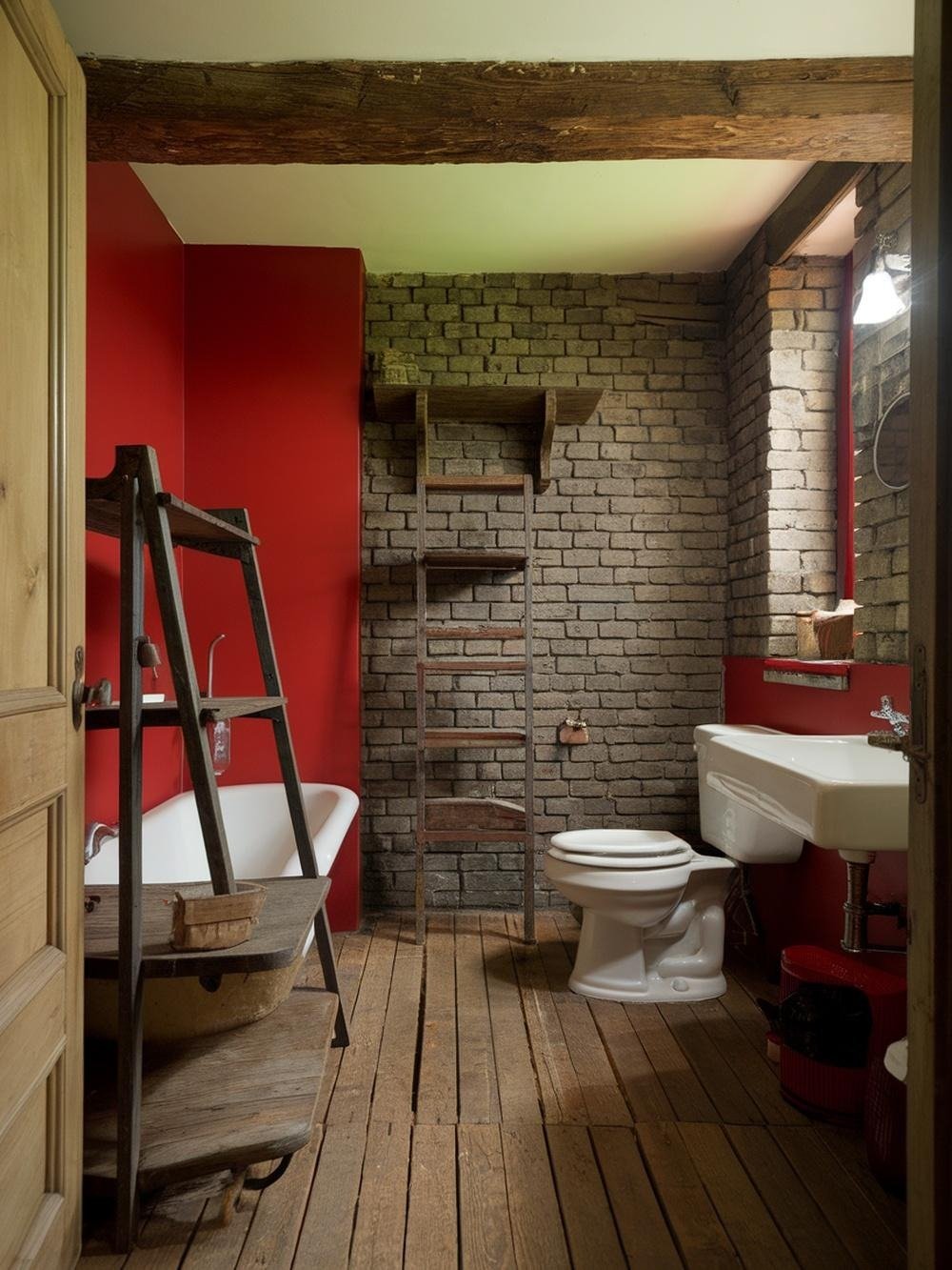 Consider incorporating similar rustic red accents in your own bathroom. A few well-placed red accessories or a bold shower curtain can transform the look. It’s a simple way to add a striking flair without overwhelming the space.