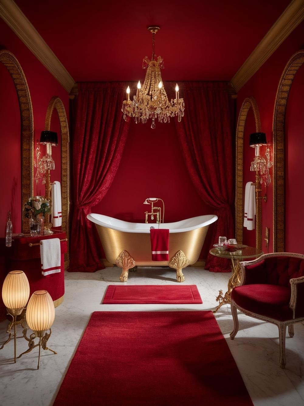 Step into a world of opulence with this stunning red and gold bathroom design. The rich red walls create a bold backdrop, making the space feel warm and inviting. A luxurious chandelier hangs from the ceiling, adding a touch of glamour and elegance. The centerpiece is a beautiful freestanding bathtub, finished in a striking gold that contrasts perfectly with the red. This combination of colors not only enhances the luxurious feel but also makes the bathroom a true statement piece.
