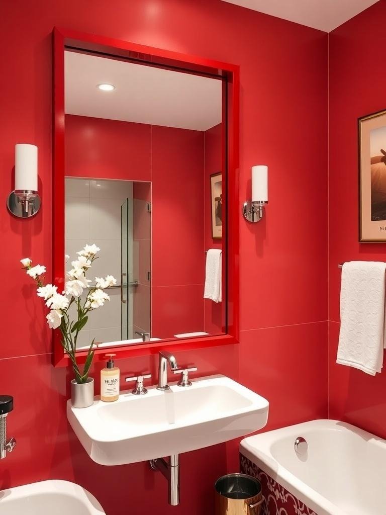 Incorporating red-framed mirrors is a great way to introduce color without overwhelming the space. They complement the white tiles and fixtures beautifully, creating a balanced look. If you’re looking to refresh your bathroom, consider this stylish option.