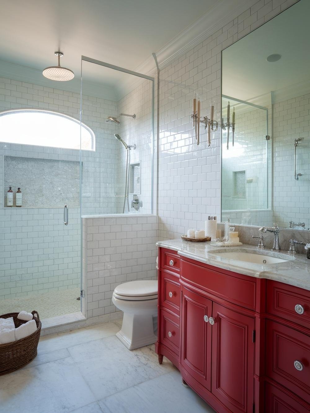 In this design, the combination of the red vanity and marble creates a warm and welcoming atmosphere. It’s perfect for those who want to make a statement in their bathroom without overwhelming the space. The clean lines and classic style of the vanity ensure it fits well in both modern and traditional settings.
