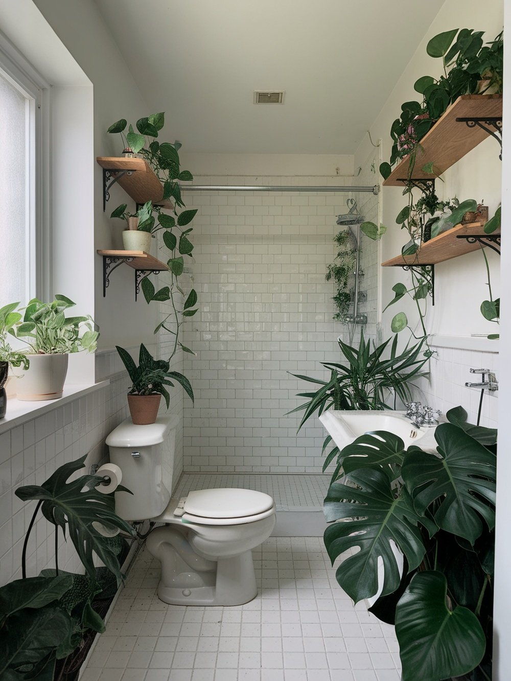 Incorporating greenery into a bathroom can transform the space into a refreshing retreat. The image showcases a bright white bathroom adorned with various plants, creating a lively contrast against the clean tiles and fixtures. Plants like pothos and monstera add a touch of nature, making the room feel more inviting. The wooden shelves not only provide a practical storage solution but also serve as a perfect platform for displaying these beautiful plants.