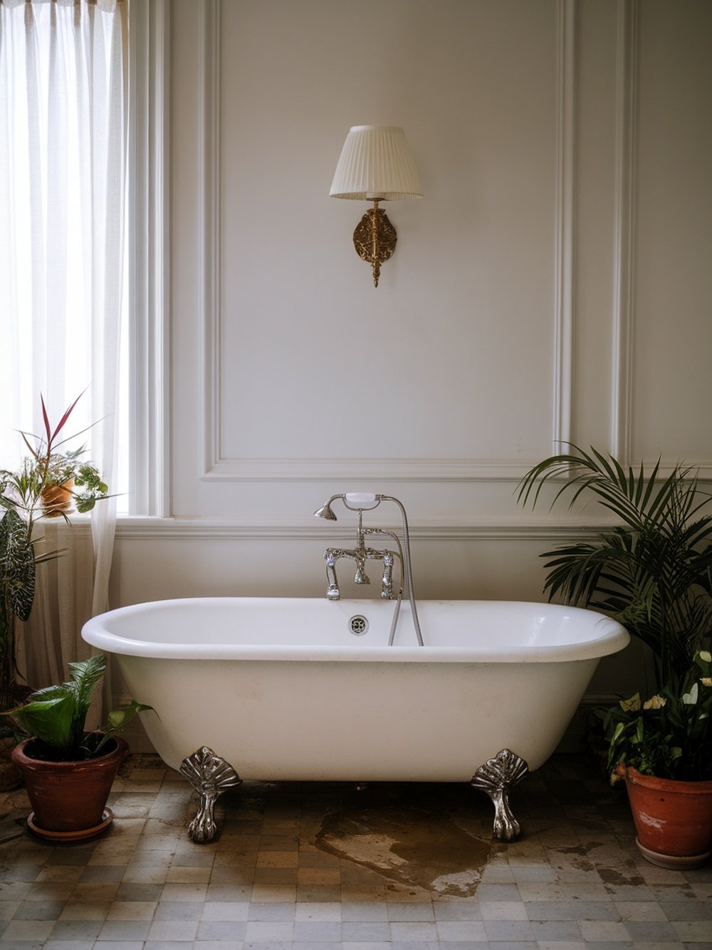 A classic white bathtub can truly transform a bathroom into a serene retreat. This particular tub, with its elegant design and charming clawfoot legs, adds a touch of vintage flair. The clean lines and smooth surface of the white finish create a refreshing look that complements any decor. Surrounding the tub, you’ll notice lovely greenery peeking from pots. These plants not only enhance the aesthetic but also bring a bit of nature indoors. The soft light filtering through the sheer curtains adds warmth, making the space feel inviting and cozy.