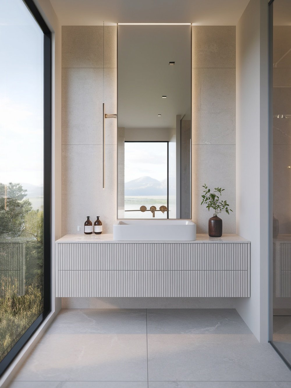 A floating vanity can completely change the vibe of your bathroom. This design creates a sense of space and openness. The image shows a sleek, modern floating vanity that is both functional and stylish. The clean lines and minimalistic approach make it a perfect fit for a white bathroom aesthetic. The vanity features a textured front, adding a subtle detail that catches the eye without overwhelming the space. Above it, a large mirror reflects natural light, making the room feel even more airy. The combination of the floating design and the large window brings in a refreshing view, enhancing the overall experience.