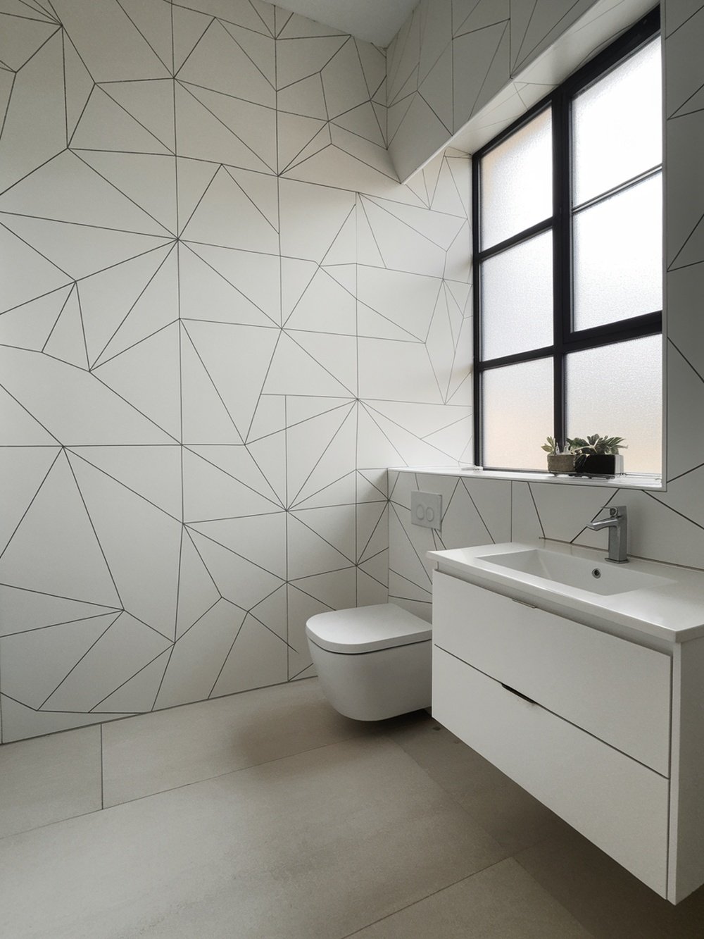 This design proves that white doesn’t have to be boring. Instead, it can serve as a canvas for creativity. Whether you choose to go bold with patterns or keep it simple, geometric designs can elevate your bathroom aesthetic.