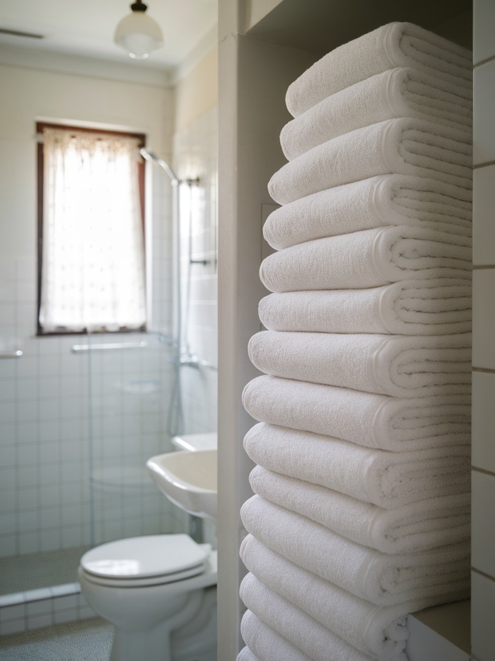 White towels are a classic choice for any bathroom. They bring a sense of cleanliness and freshness that can instantly uplift the space. In this image, neatly stacked towels create a crisp and inviting look. The soft texture and bright color stand out against the backdrop of the bathroom.