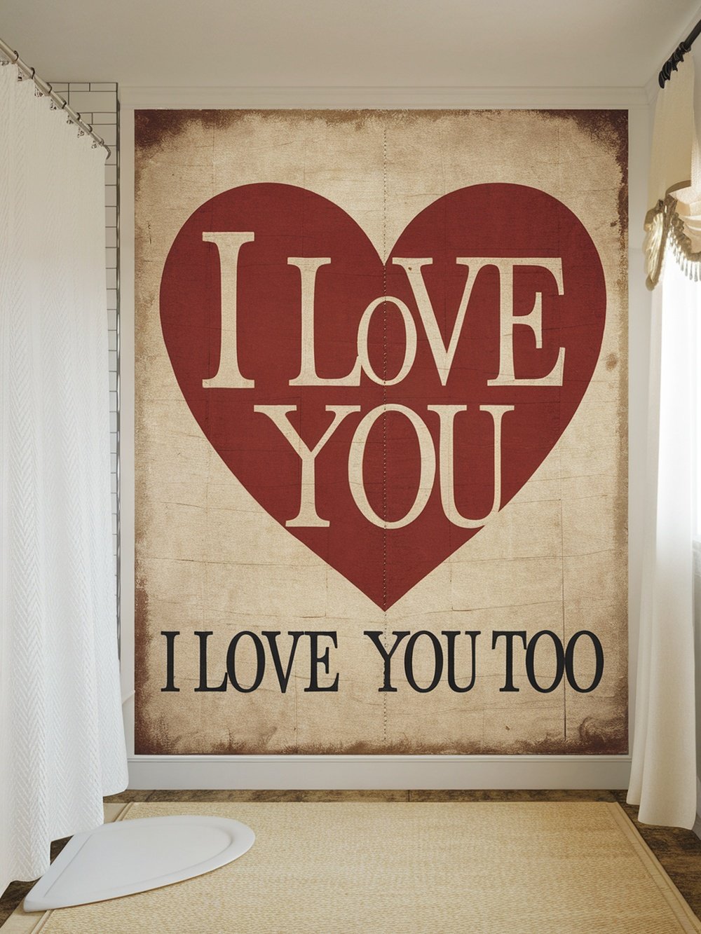 In a bathroom filled with white tones, a striking piece of art can truly make a statement. The image showcases a large, vibrant artwork featuring a bold red heart with the words ‘I LOVE YOU’ prominently displayed. This eye-catching piece adds a splash of color and personality to an otherwise simple space. The clean lines of the bathroom, with its white shower curtain and sink, create a perfect backdrop for the art. The contrast between the bright red and soft beige tones of the artwork draws the eye immediately, making it the focal point of the room.
