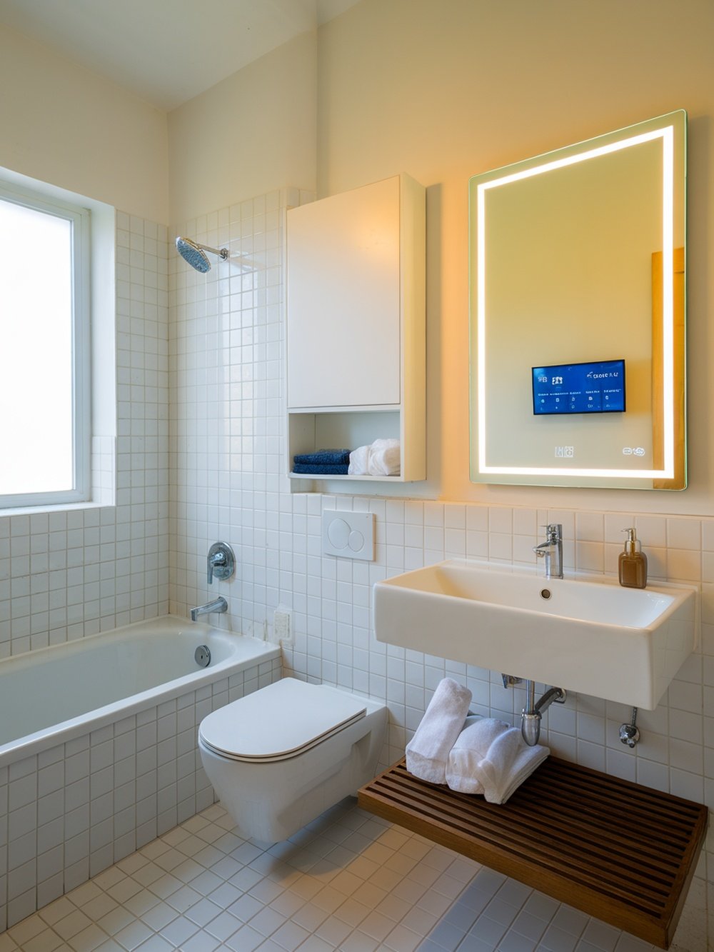In modern bathrooms, technology plays a big role in enhancing comfort and convenience. The image showcases a sleek bathroom that integrates various tech features seamlessly into its design. The standout element here is the smart mirror. It not only reflects your image but also displays useful information like time and temperature. This feature makes morning routines smoother and more efficient.