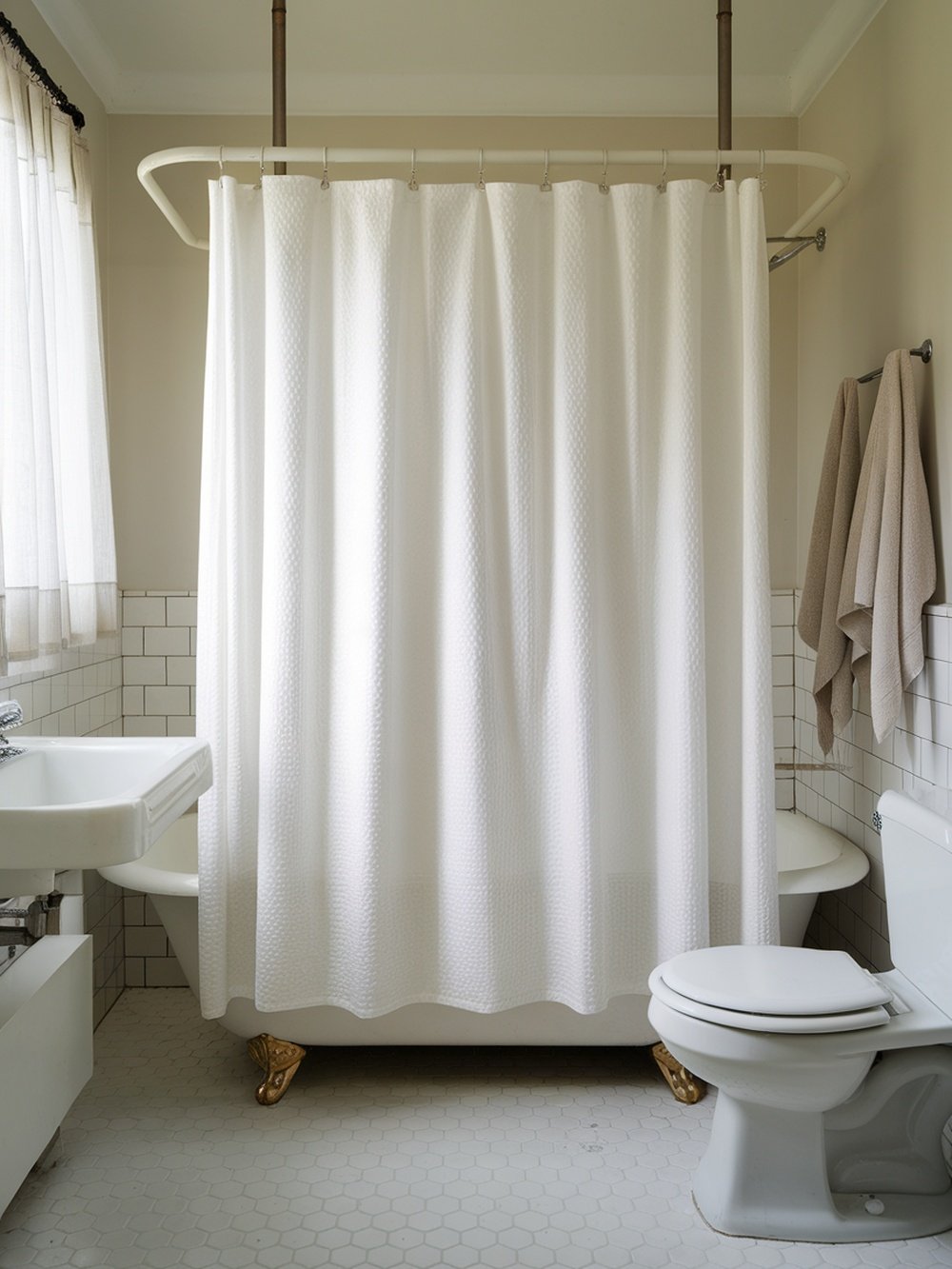Notice how the curtain’s design pairs well with the vintage-style bathtub. The golden feet of the tub peek out, adding a touch of charm. This combination shows how a white shower curtain can elevate a bathroom’s style. With natural light streaming in, the space feels inviting. A white shower curtain not only looks good but also brightens up the room, making it feel larger and more open.