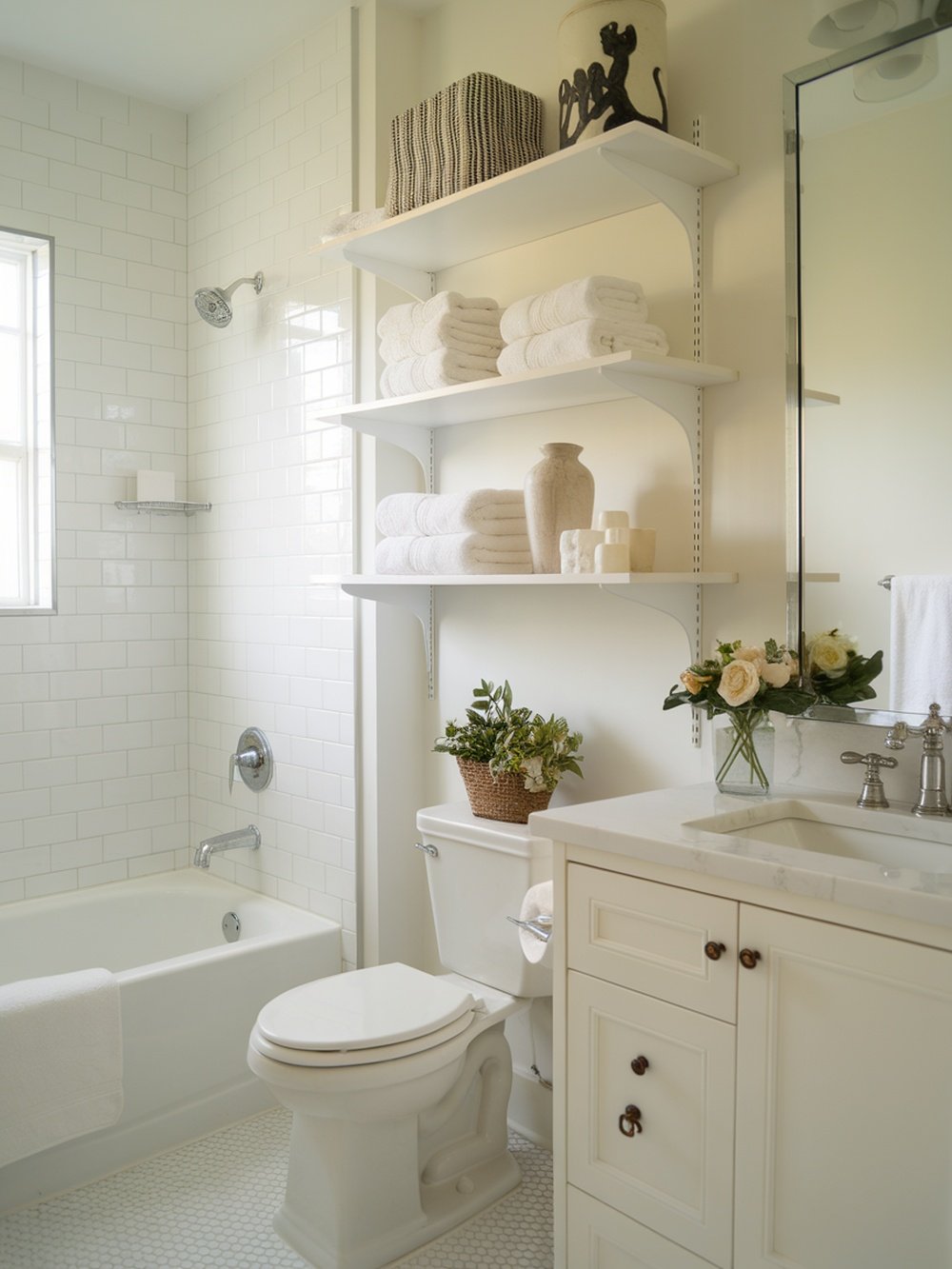 Open shelving in a bathroom is a stylish and practical choice. It offers easy access to essentials while keeping the space feeling airy and open. In the image, you can see how neatly folded towels and decorative items are displayed on the shelves. This not only adds to the decor but also makes it easy to grab what you need. The white shelves blend seamlessly with the overall clean aesthetic of the bathroom. They provide a great contrast against the tiled walls and enhance the light, bright feel of the space. Using open shelves allows for personal touches, like adding plants or decorative baskets, which can bring warmth and character to a minimalist design.