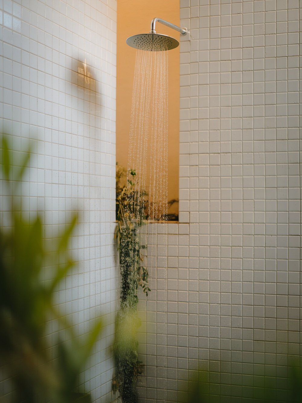 This shower nook is a perfect blend of simplicity and comfort. The clean, white tiles create a fresh look, making it feel like a personal spa. The overhead shower head delivers a gentle cascade of water, inviting you to unwind after a long day. The addition of greenery adds a touch of nature, enhancing the serene atmosphere. It’s a great way to bring the outdoors in, making your shower experience feel refreshing and rejuvenating.