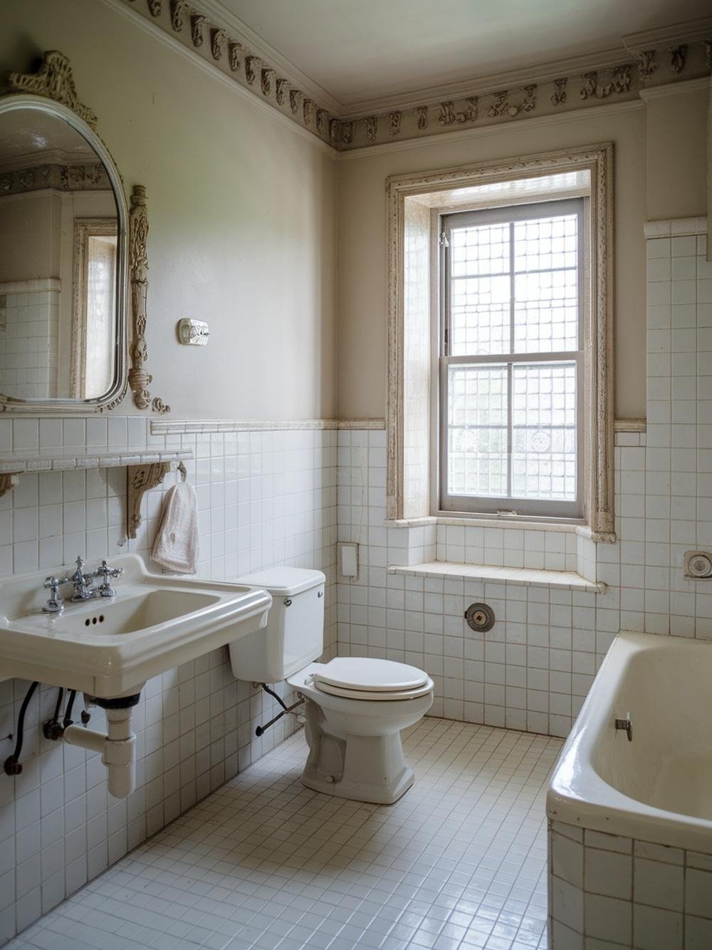 When it comes to vintage white fixtures, this bathroom showcases a lovely blend of classic charm and functionality. The white sink and toilet stand out against the soft, muted tones of the walls and tiles, creating a clean and inviting space. The vintage mirror adds a touch of elegance, reflecting the natural light streaming in from the window. This detail not only brightens the room but also enhances the overall aesthetic. The intricate molding along the ceiling complements the fixtures beautifully, tying the whole look together.
