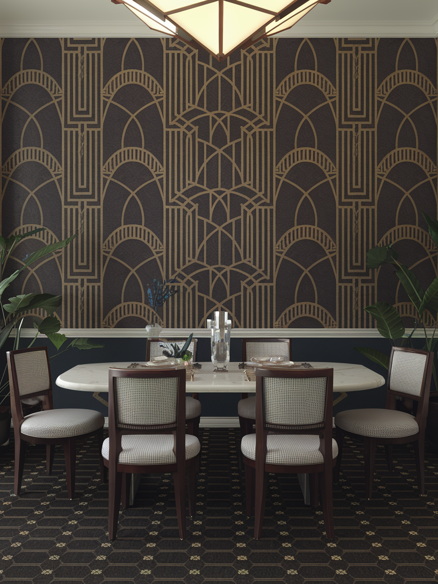 Geometric patterns are the heart of Art Deco design. A statement wall with bold wallpaper instantly brings drama and visual interest to your dining room. Think black and gold triangles, chevrons, or fan patterns. Pair the wall with sleek furniture in muted tones so it doesn’t feel overwhelming. You can even use subtle metallics for a touch of luxury. This creates a stunning focal point that makes your dining room feel curated and stylish, and guests will definitely notice the artistic flair before they even sit down to eat.