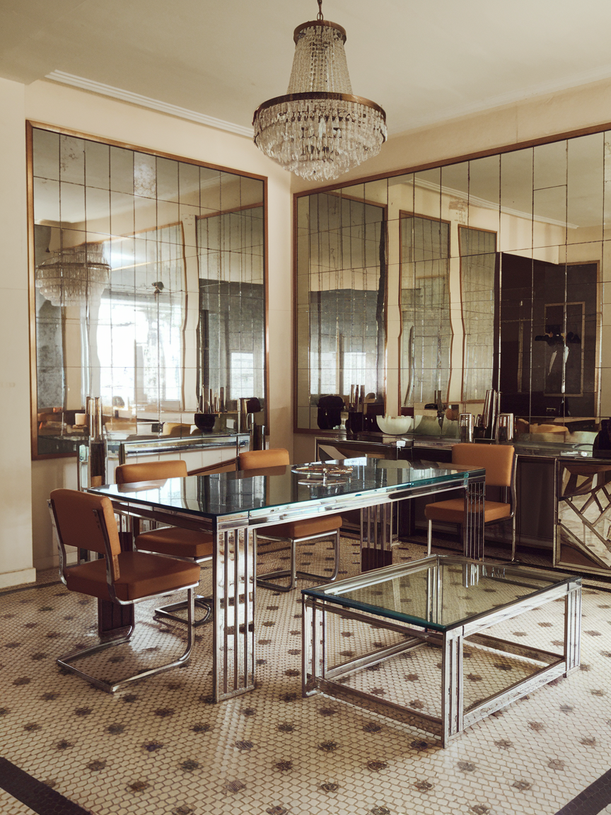 For a modern twist on vintage glam, glass and chrome dining tables are perfect. The reflective surfaces make the room feel larger while staying true to the Art Deco emphasis on luxury and shine. Glass tables are versatile, pairing easily with bold or neutral seating. Chrome legs or frames add a metallic edge that complements other accents like chandeliers or mirrors, creating a cohesive, polished look. It’s an elegant choice for small or open dining spaces where you want to maximize light and visual impact.