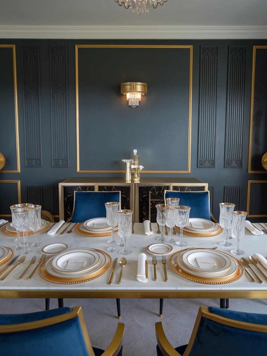 Elevate your Art Deco dining room with tableware that complements the glamour of the space. Think gold-rimmed plates, crystal glassware, and polished silverware. Decorative chargers, folded napkins, and stylish centerpieces can all enhance the overall aesthetic. Coordinating your table setting with your room’s color palette adds cohesion while impressing guests. A well-set table transforms every meal into a luxurious experience, making your dining room feel elegant, intentional, and very Instagram-worthy.