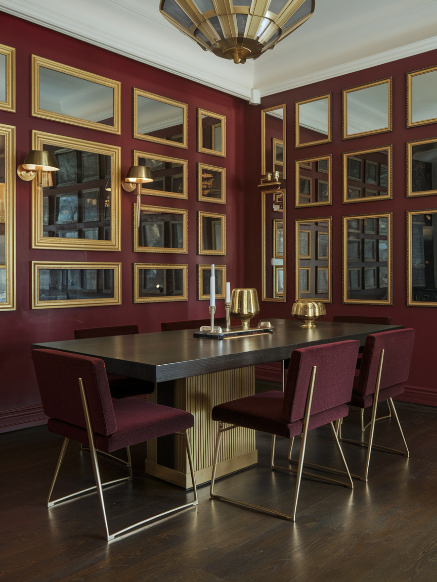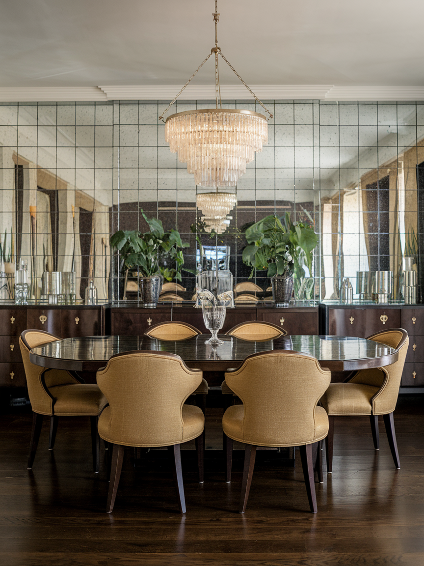 Mirrored backsplashes behind sideboards or buffets reflect light and create a sense of depth. They make smaller rooms feel more spacious and add a glamorous touch. Pair mirrors with metallic accents or geometric patterns for a cohesive Art Deco look. It’s a simple addition that elevates the elegance of your dining area while enhancing functionality and visual interest.