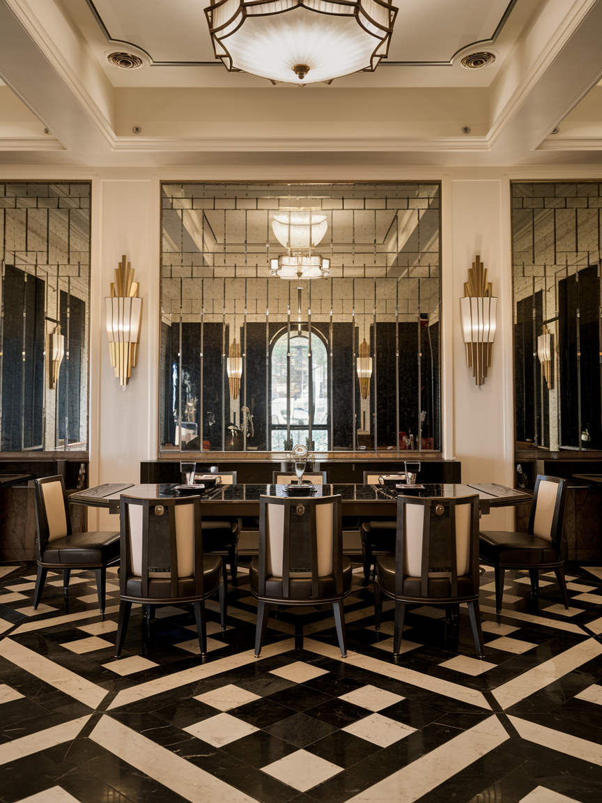 Patterned flooring, such as black-and-white tiles or geometric parquet, immediately evokes Art Deco charm. Bold flooring can act as a foundation for your room’s design, complementing furniture and wall treatments. High-contrast tiles enhance visual interest and guide the eye around the space. Paired with metallic accents and luxurious textiles, patterned flooring makes your dining room feel curated, stylish, and timelessly glamorous.