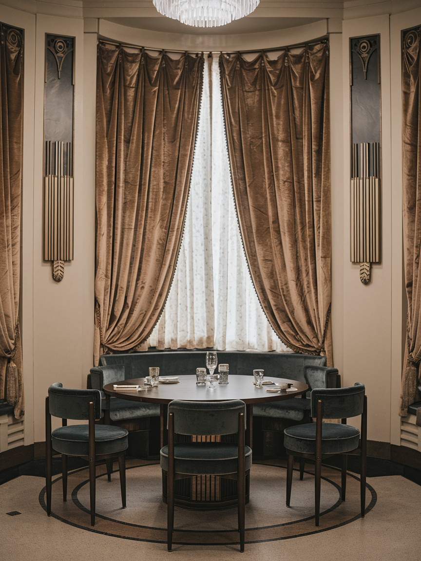 Soft, plush curtains in velvet or satin add texture, color, and elegance. They frame windows beautifully while enhancing privacy and light control. Choose colors that complement your walls or furniture to maintain a cohesive Art Deco aesthetic. Heavy drapes in luxurious fabrics instantly upgrade a dining room, giving it a warm and inviting ambiance while remaining visually sophisticated.