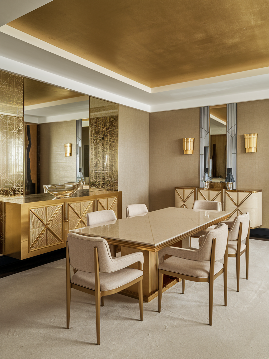 Don’t overlook the ceiling when designing your Art Deco dining room. Painted patterns, metallic finishes, or geometric plaster details can create a dramatic effect that draws the eye upward. A ceiling with bold design not only adds depth but also reinforces the luxurious and glamorous aesthetic that defines Art Deco. Consider incorporating metallic trim or subtle murals for a unique, stylish touch. A well-designed ceiling turns your dining area into a complete, immersive experience, making every element of the room feel intentional and visually striking.