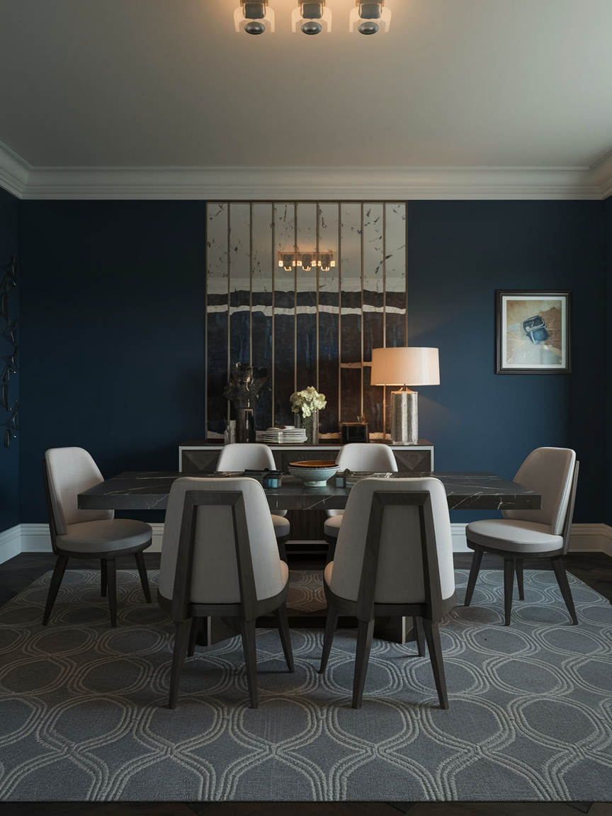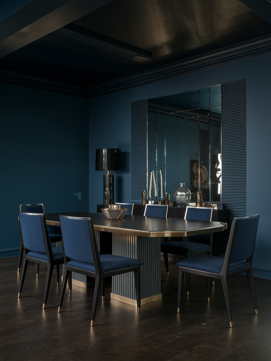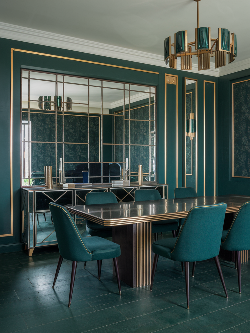 Art Deco thrives on dramatic contrasts. Deep blues, emerald greens, black, and rich purples paired with metallic accents instantly create a glamorous atmosphere. Don’t shy away from dark walls if you want a moody, sophisticated vibe. Balance bold colors with lighter neutrals on floors or ceilings to prevent the room from feeling too heavy. Playing with color adds personality and energy to your dining space, ensuring it feels stylish and lived-in rather than sterile.