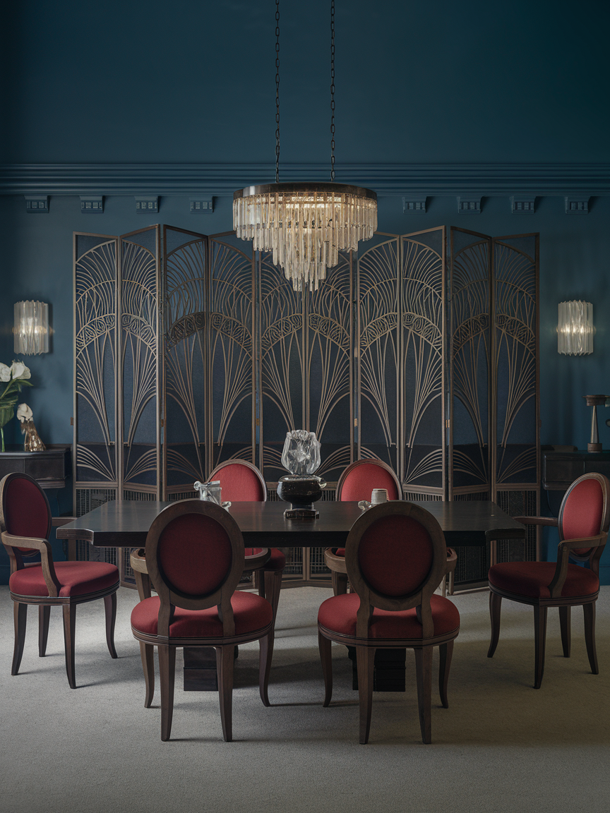 Decorative screens or room dividers add a sense of sophistication and flexibility to your dining area. Choose screens with geometric patterns, lacquered finishes, or mirrored surfaces to enhance the Art Deco vibe. They can define your dining space in open-plan homes, add privacy, or simply serve as a stylish focal point. Decorative screens are both functional and ornamental, giving your room a layered, curated feel that embodies the luxury and drama of vintage glamour.