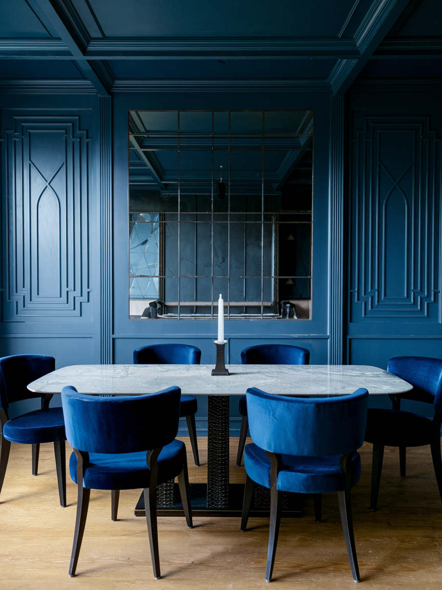 Velvet dining chairs are indulgent, comfortable, and perfect for Art Deco elegance. Choose jewel tones like emerald, sapphire, or ruby for maximum glam. Velvet adds texture and richness, creating a luxurious seating experience for you and your guests. You can mix and match colors for a playful look or keep a single tone for a more sophisticated vibe. Chairs with gold or brass legs elevate the style even more, making your dining area feel like it belongs in a 1920s speakeasy, without sacrificing modern comfort.