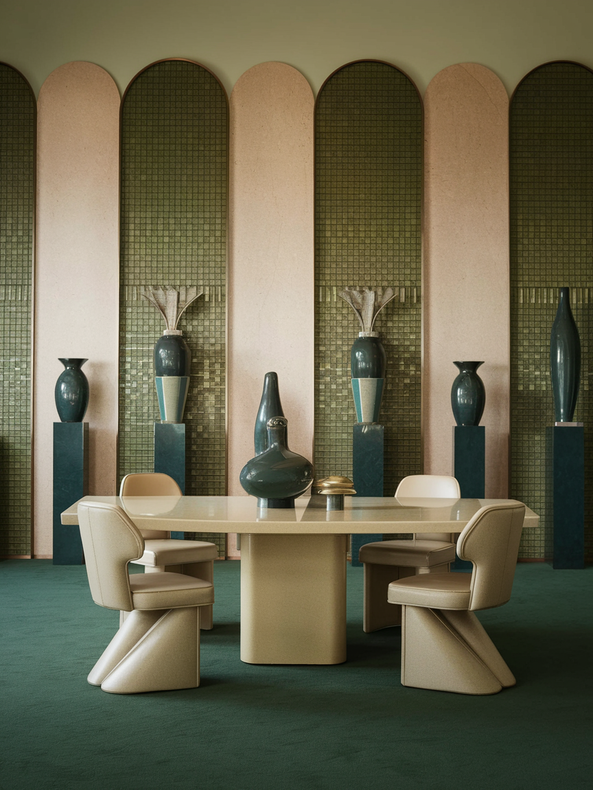 Sculptural vases, candleholders, or statues can bring Art Deco flair to your surfaces. Look for pieces with clean lines, geometric shapes, or stylized motifs. These objects act as mini works of art, drawing the eye without overpowering the space. Place them strategically on sideboards, tables, or shelves to create visual interest at varying heights. Sculptural accessories provide a sense of curated elegance and reflect your personality, helping to make your Art Deco dining room feel both luxurious and approachable.