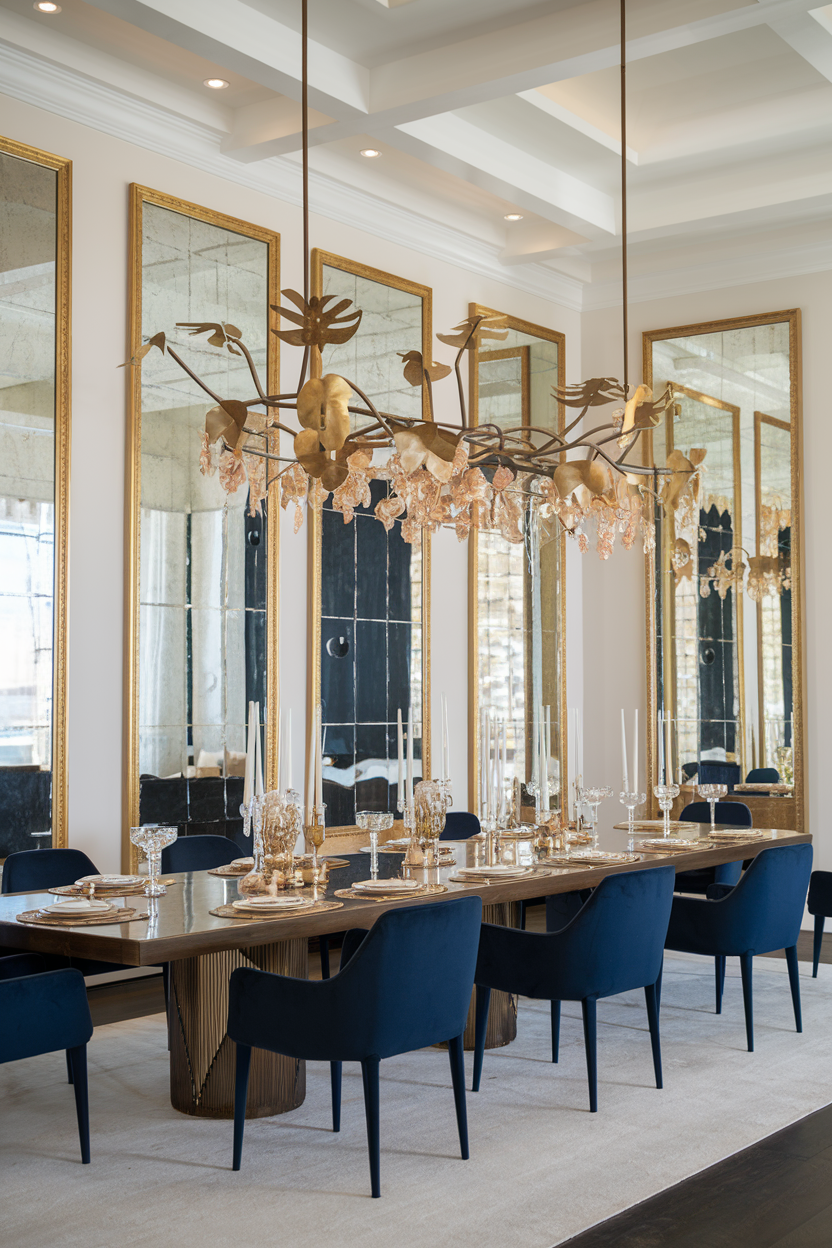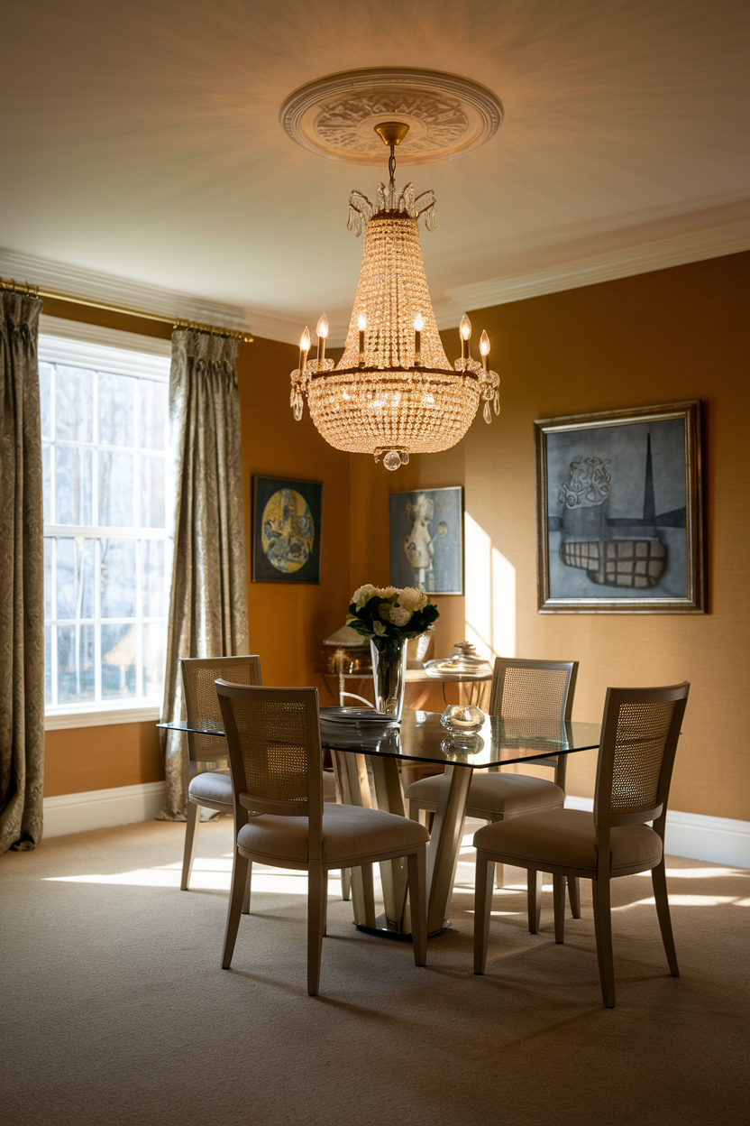 A crystal chandelier instantly brings elegance and opulence to your dining room. The sparkling crystals reflect light beautifully, creating a luxurious ambiance that’s perfect for formal gatherings or celebratory dinners. Pair it with high ceilings and a neutral color palette to really let the chandelier shine. Whether you go for a traditional or a more modern design, it’s sure to become the room’s dazzling focal point.