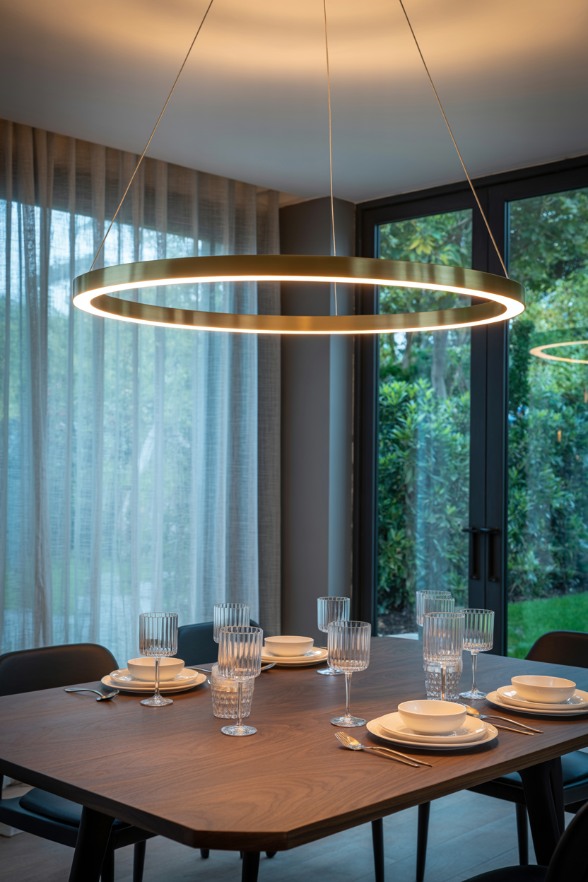Ring chandeliers offer a sleek, modern twist on traditional circular lighting. These fixtures often feature integrated LEDs that create a seamless, glowing ring of light. Hung above a rectangular or round table, they provide even illumination and a futuristic touch. Choose a double-ring design for extra impact or a matte black finish to add bold contrast in a bright room.