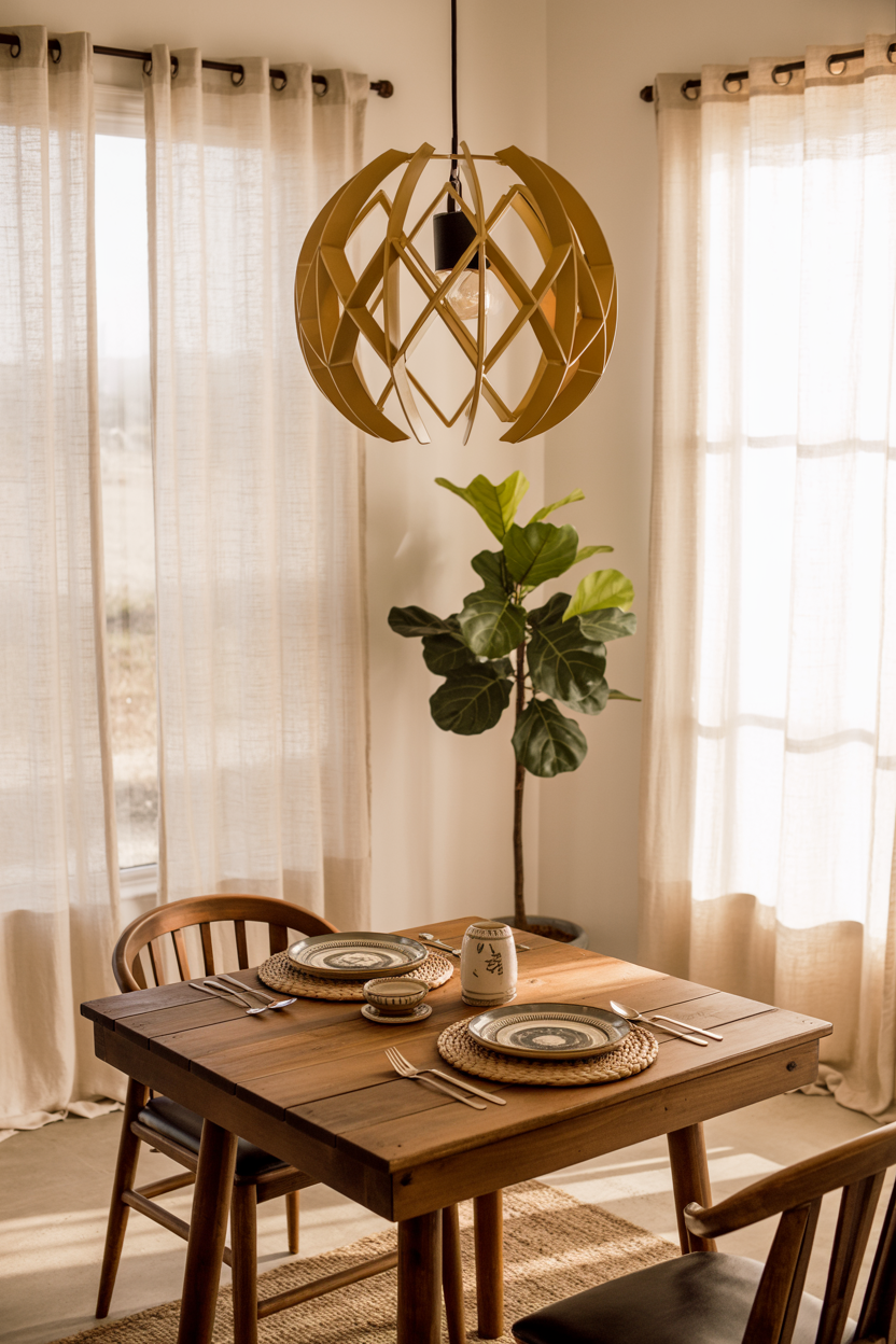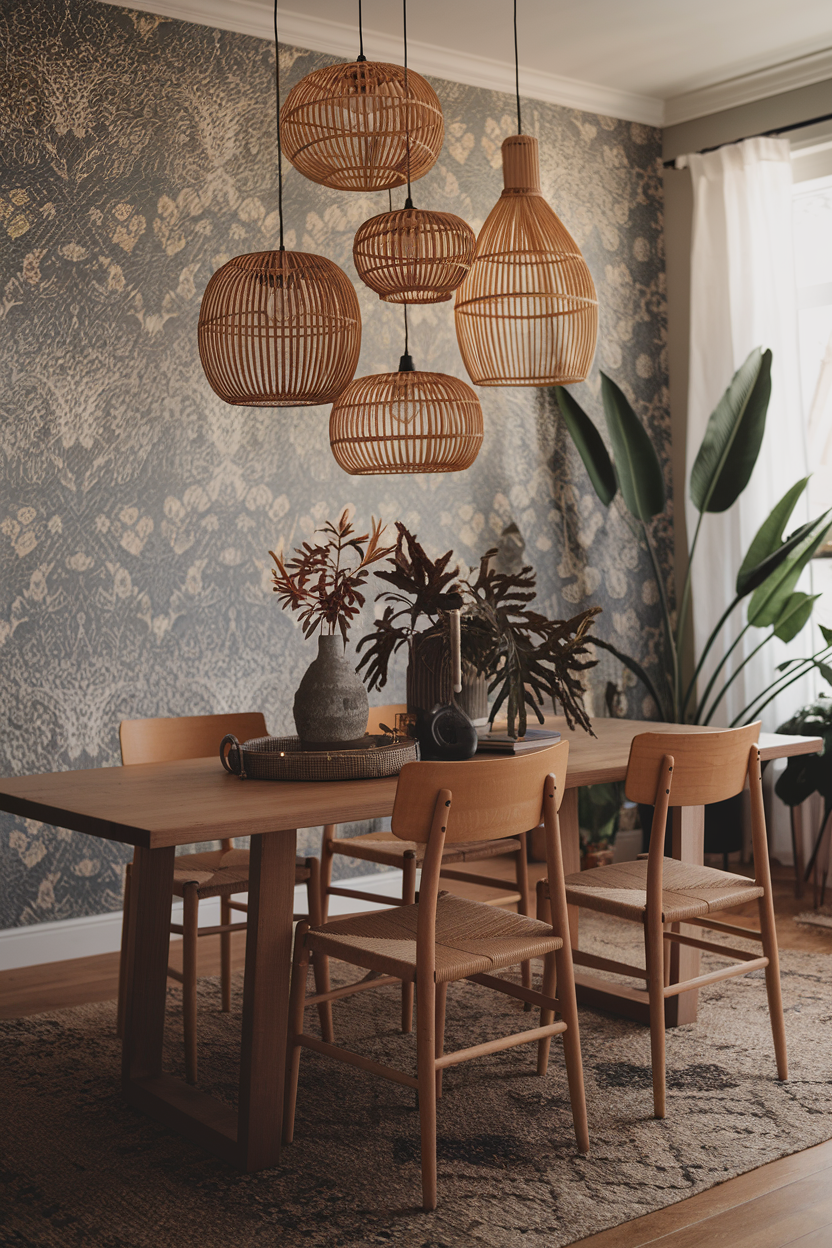 Rattan and wicker pendant lights bring a natural, earthy feel to your dining area. Their woven textures diffuse light softly, creating a warm and relaxed ambiance. Perfect for bohemian or coastal-style homes, they pair beautifully with wood furniture, linen tablecloths, and plenty of greenery. A cluster of different-sized pendants can enhance the eclectic, layered feel of the room.