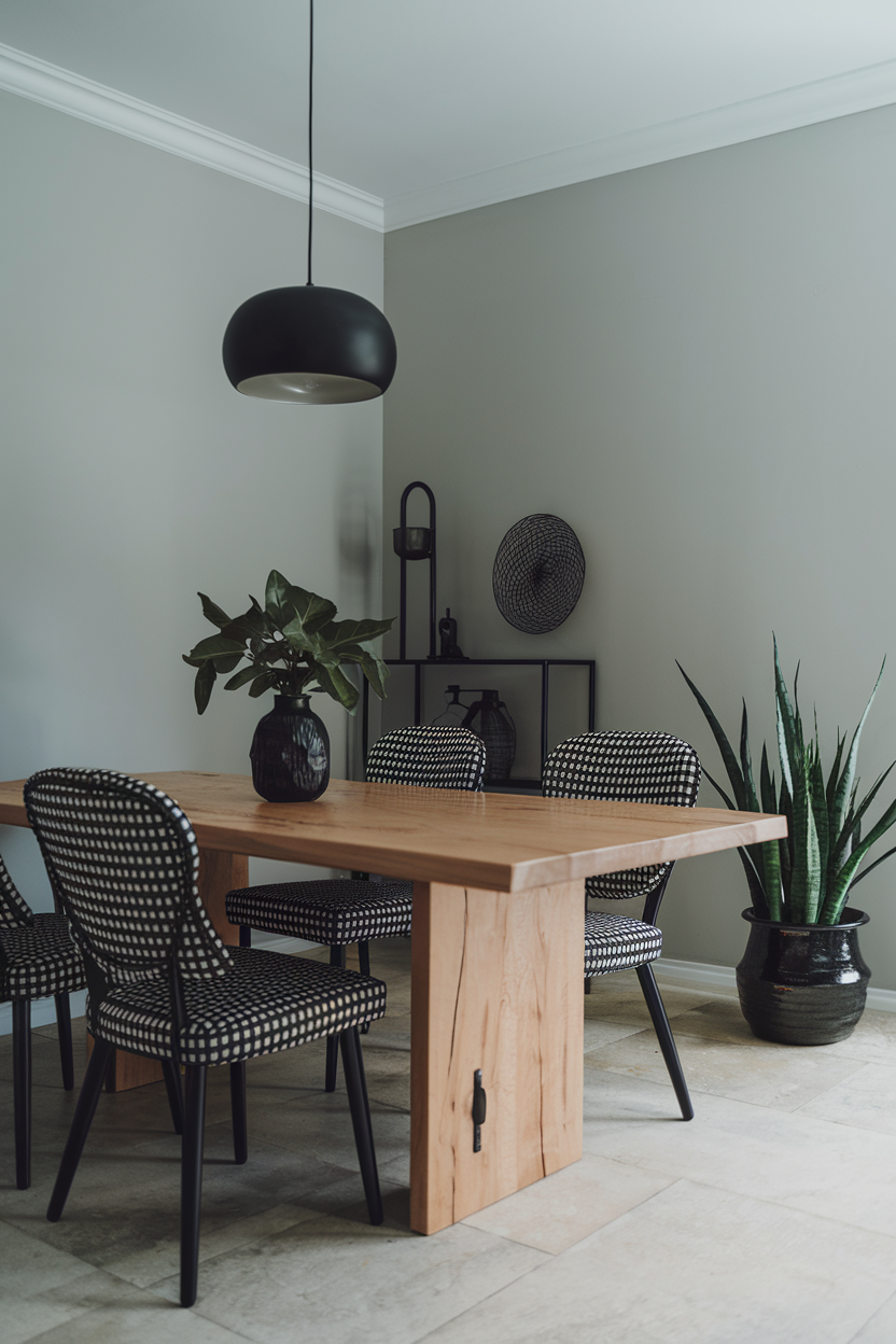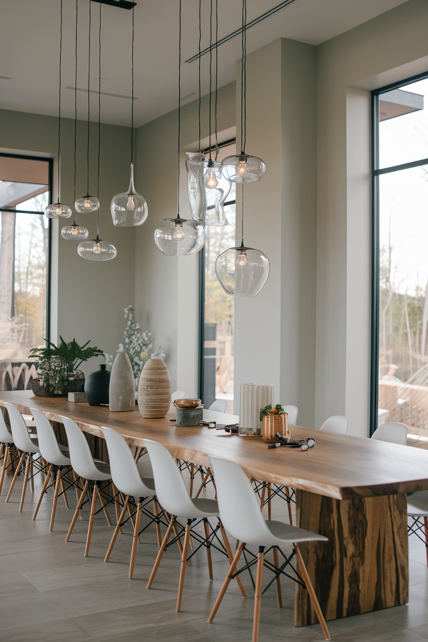 A cluster of pendant lights at varying heights adds a dynamic and playful element to your dining area. This style works particularly well in spaces with high ceilings or dramatic architecture. Choose pendants in the same material for a cohesive look or mix and match for a more bohemian feel. The staggered design creates depth and movement above the dining table.
