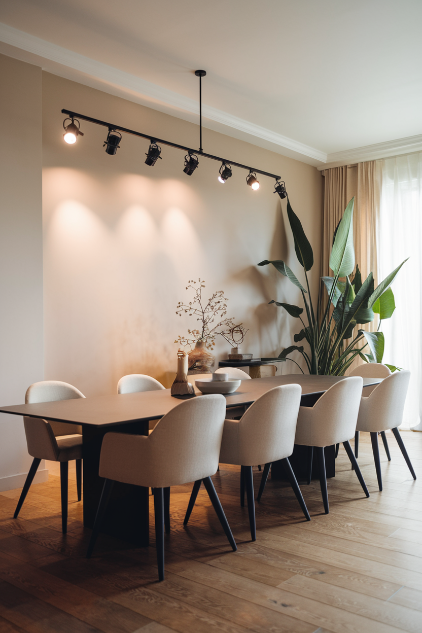 Track lighting isn’t just for kitchens, it can work wonders in a modern dining room. With adjustable heads, you can direct light where it’s needed most, whether it’s highlighting artwork or focusing on the table. Sleek and functional, this style is perfect for contemporary interiors or multipurpose spaces. Choose a minimalist design in black or white to keep the look streamlined and modern.