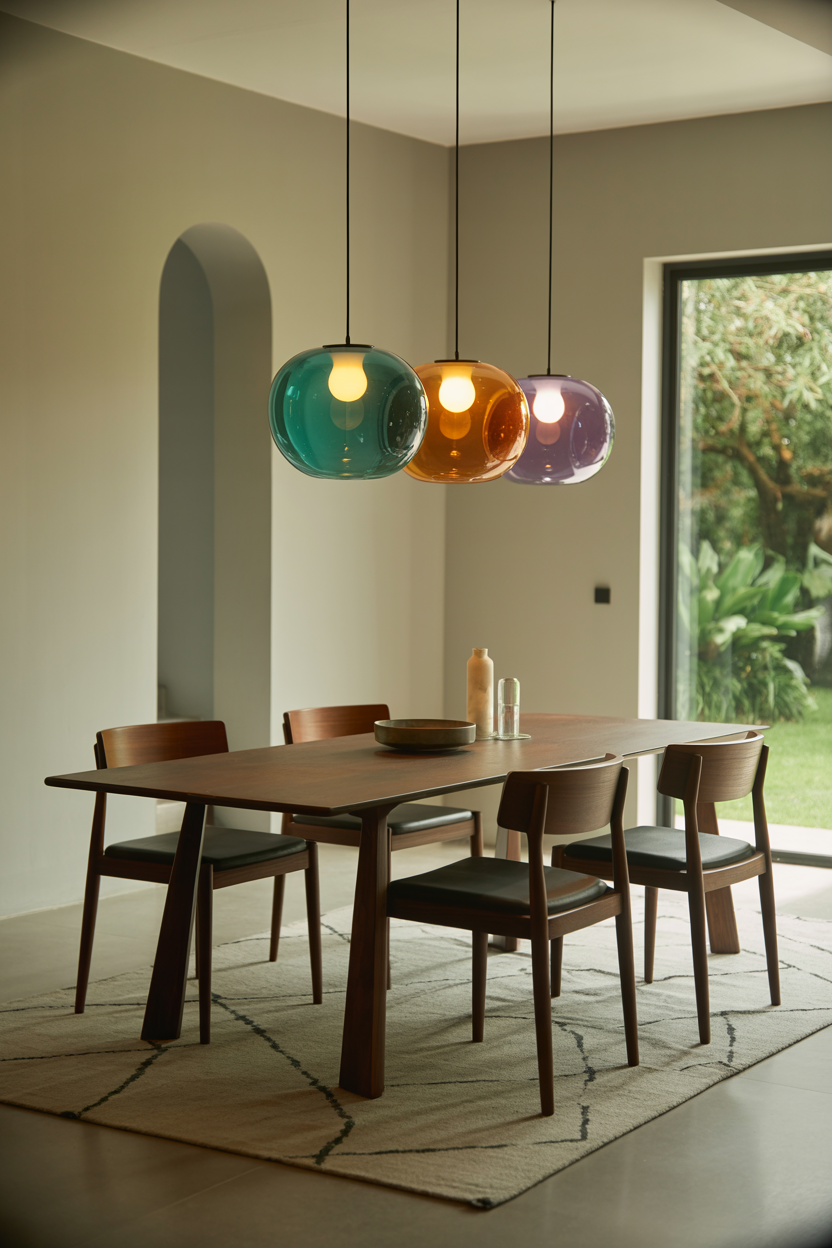 Inject some personality into your dining room with colorful glass pendant lights. These fixtures come in a range of hues, from soft pastels to bold jewel tones, and add a vibrant, playful touch to your decor. Colored glass not only adds visual interest but also alters the tone of the light, casting a warm or cool glow depending on your choice. They work beautifully in eclectic or modern spaces that celebrate creativity.