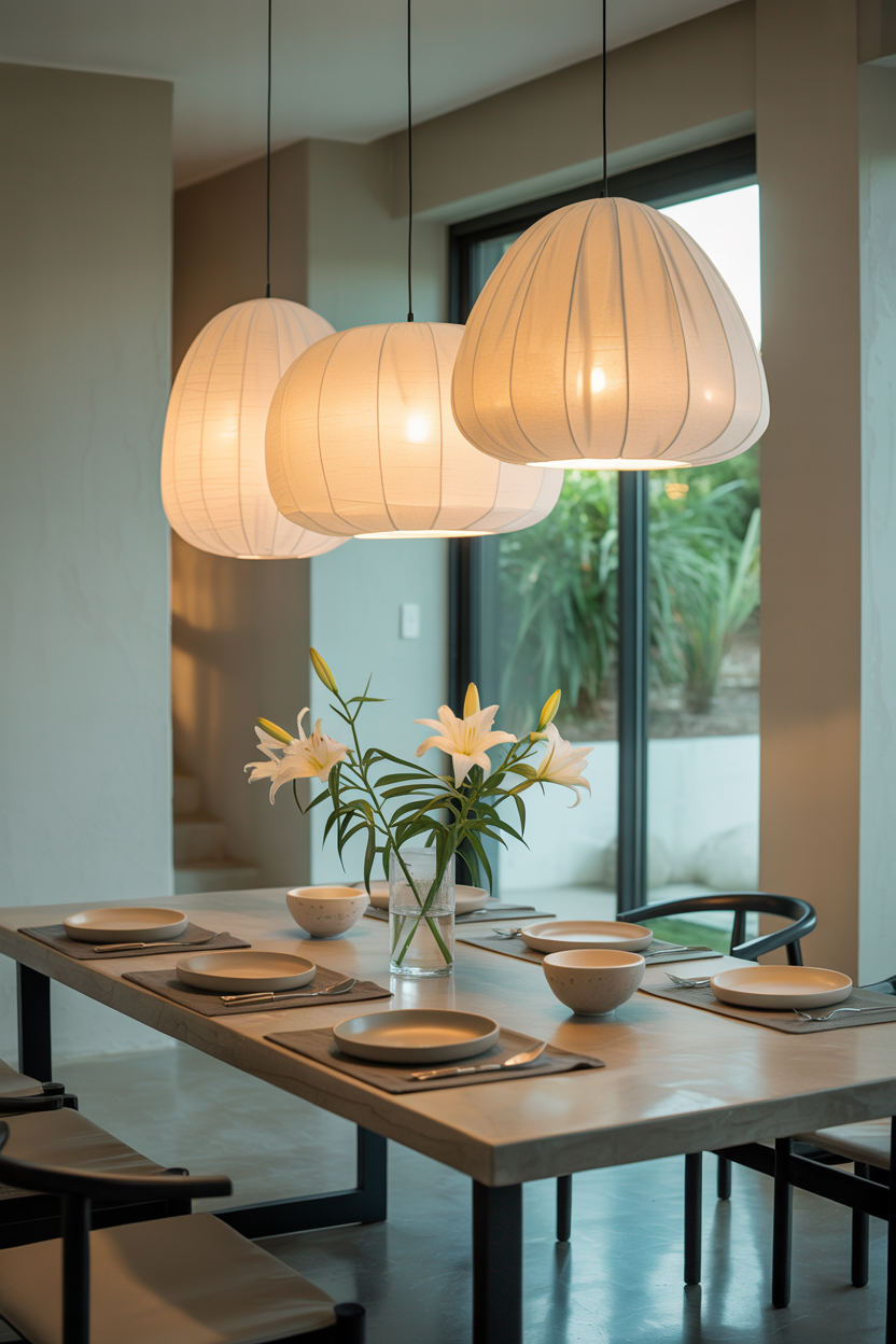 Fabric lantern lighting brings a soft, serene quality to your dining room. These fixtures, often inspired by Japanese or Scandinavian design, provide a diffused, even light that creates a calming atmosphere. Opt for neutral or pastel shades to maintain a minimalist look, or try oversized designs to introduce some drama while preserving a sense of lightness. This style works beautifully in airy, relaxed spaces with natural materials and muted color schemes.