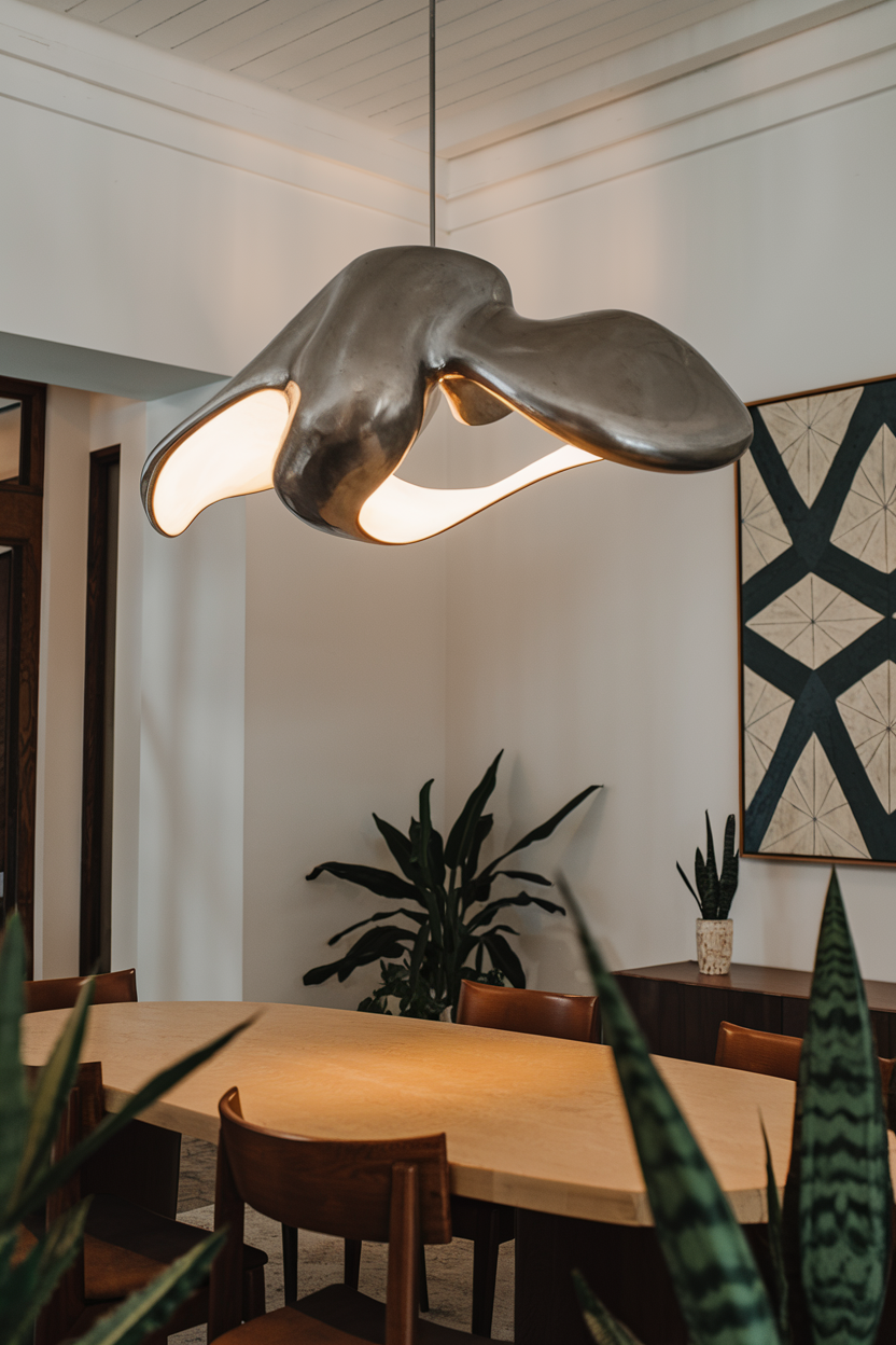 Turn your lighting into a piece of art with a sculptural fixture that doubles as a design statement. These lights often feature organic shapes, asymmetry, or abstract forms that command attention. Whether made from metal, glass, or ceramic, they add a contemporary edge and creative personality to the dining room. These are perfect for those who love bold, conversation-starting pieces.