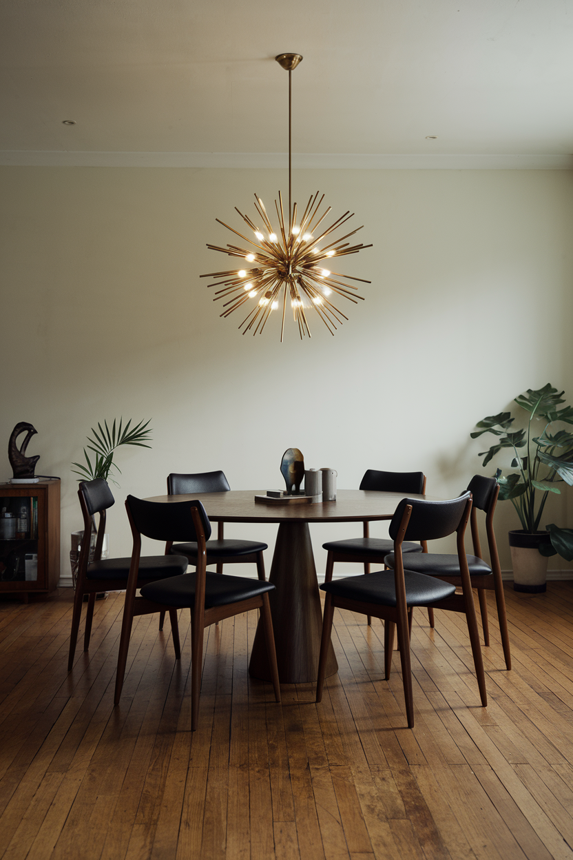 Mid-century chandeliers typically feature clean lines, brass finishes, and starburst or sputnik silhouettes. These fixtures evoke retro glamour while still feeling modern and timeless. They suit a range of interiors, from minimalist to eclectic, and look particularly striking above a round dining table. Their symmetrical design adds a balanced focal point without overwhelming the space.