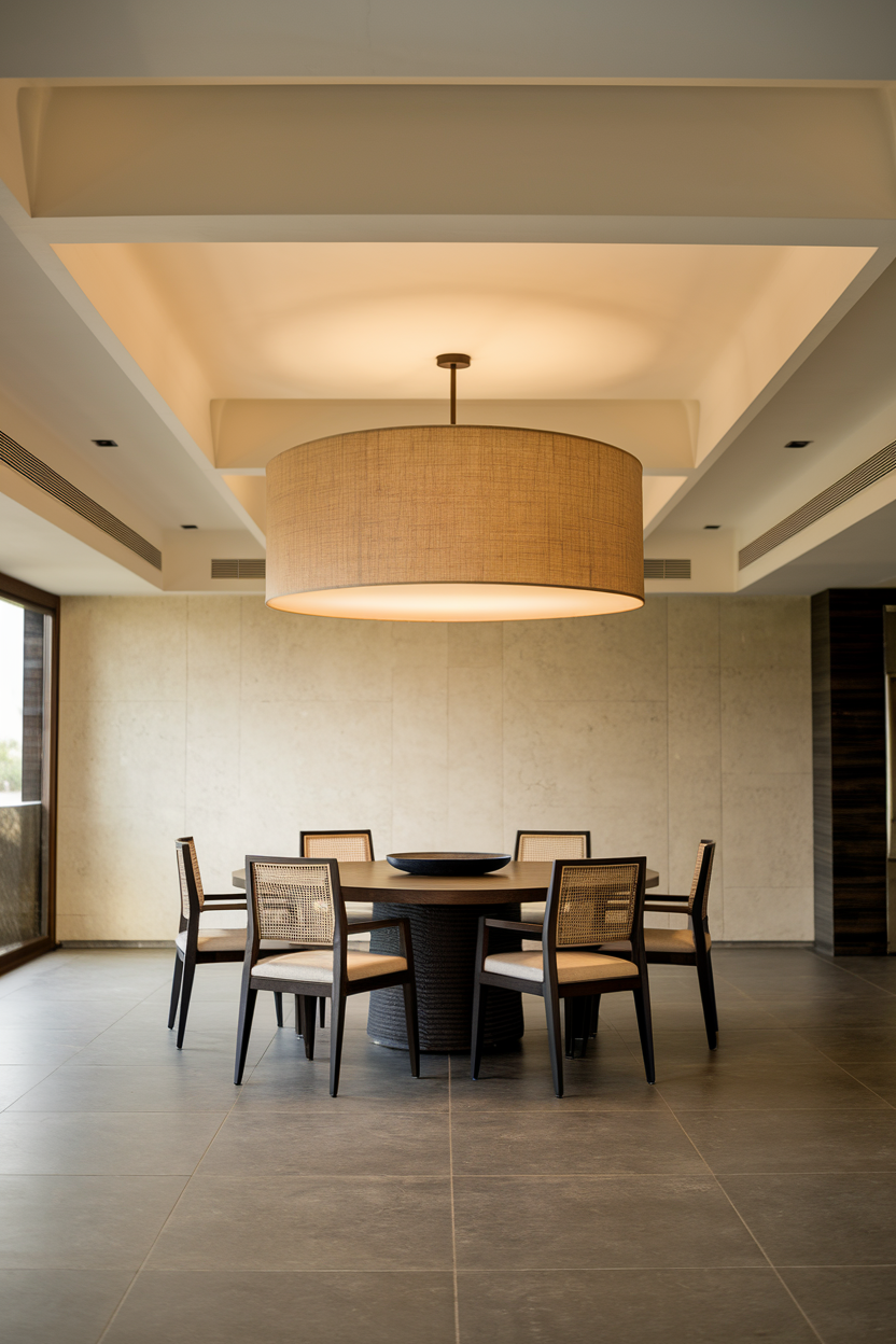 Oversized drum shades create a cozy yet bold statement. These fixtures are great for soft, diffused lighting and work well in both traditional and modern settings. Choose a fabric shade for a softer look, or go for a metal or woven texture to add visual interest. The large scale of the shade anchors the dining table and helps define the eating area within an open-plan space.