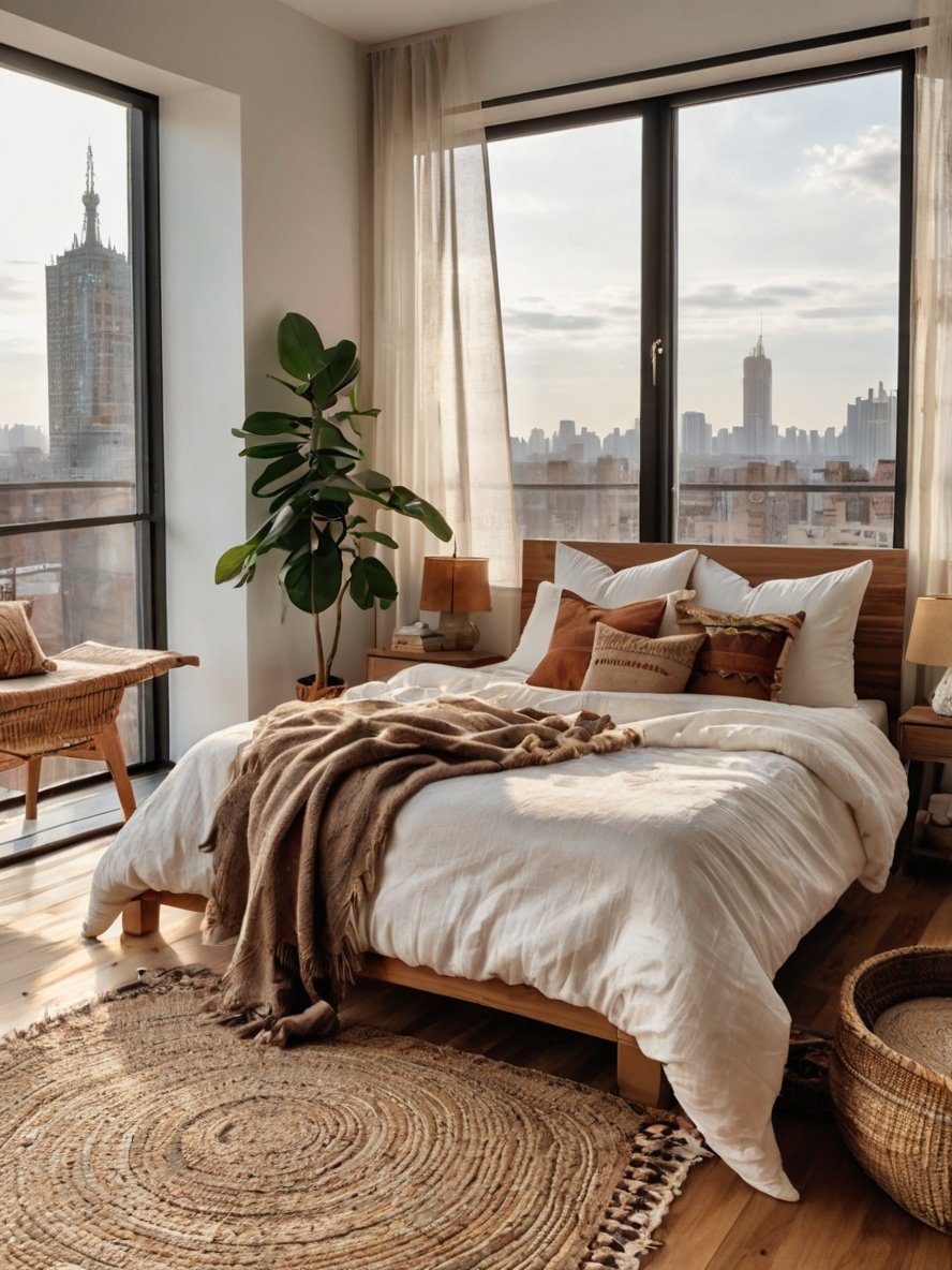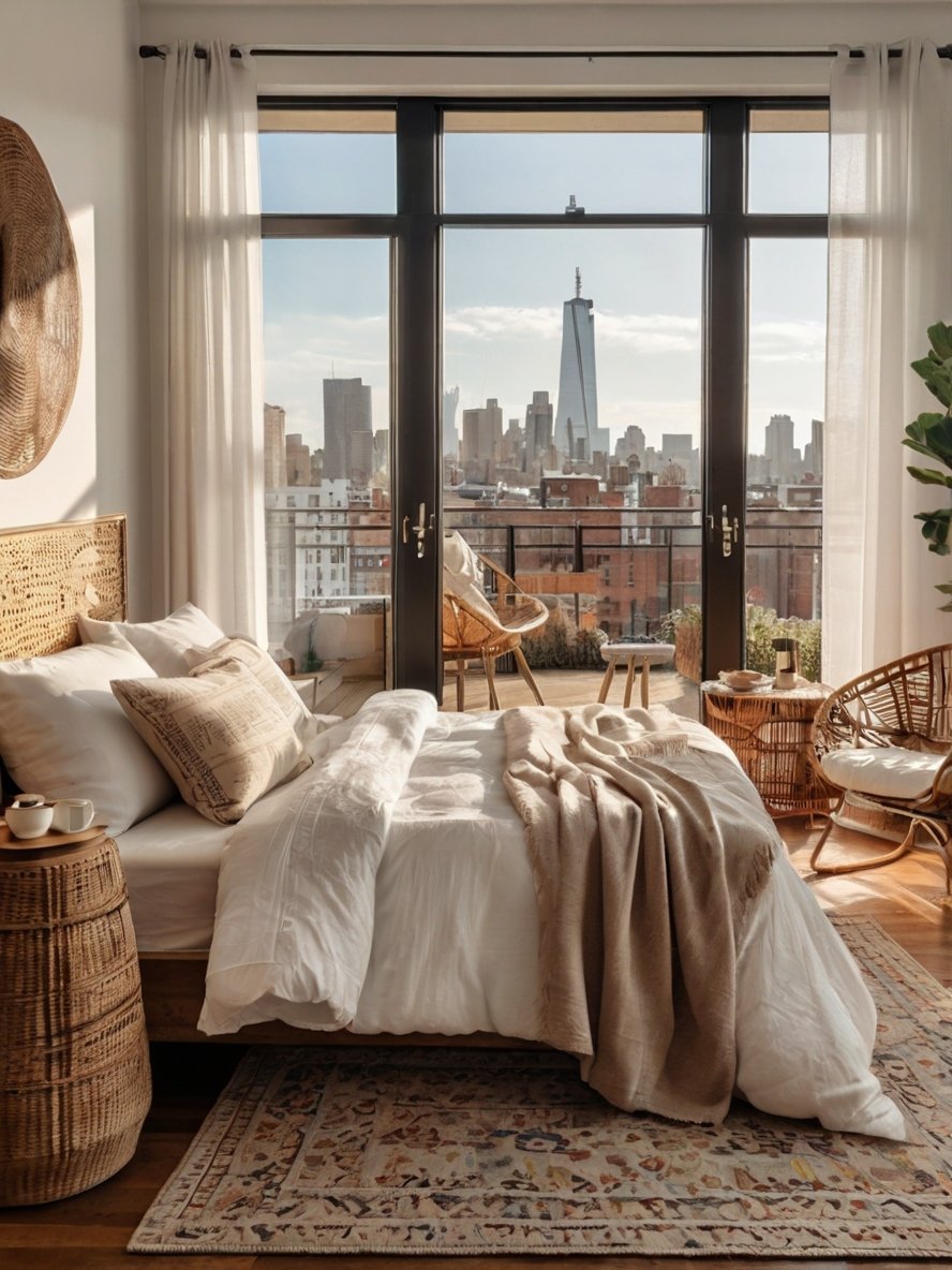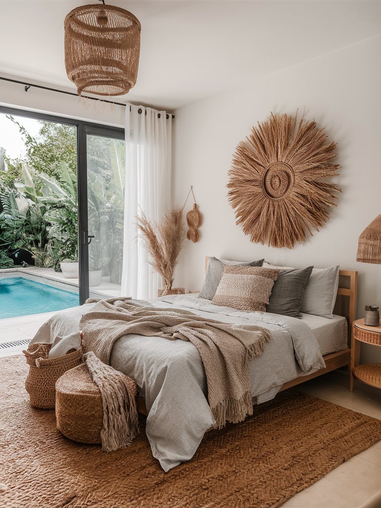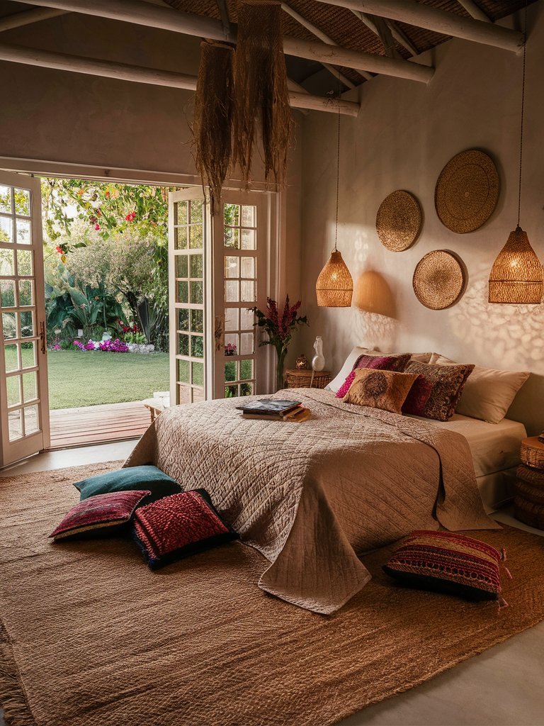 Despite the rich textures and layered elements, this bedroom maintains a minimalist approach that prevents it from feeling overwhelming. The carefully selected furniture and decor pieces ensure that every element adds value without cluttering the space. The combination of soft textiles, handcrafted details, and warm lighting creates an ambiance that feels both cozy and intentional. This balance between minimalism and bohemian warmth makes the bedroom feel effortlessly stylish and comfortable. The open space, natural light, and organic materials work together to create a sanctuary-like retreat, perfect for relaxation and tranquility.