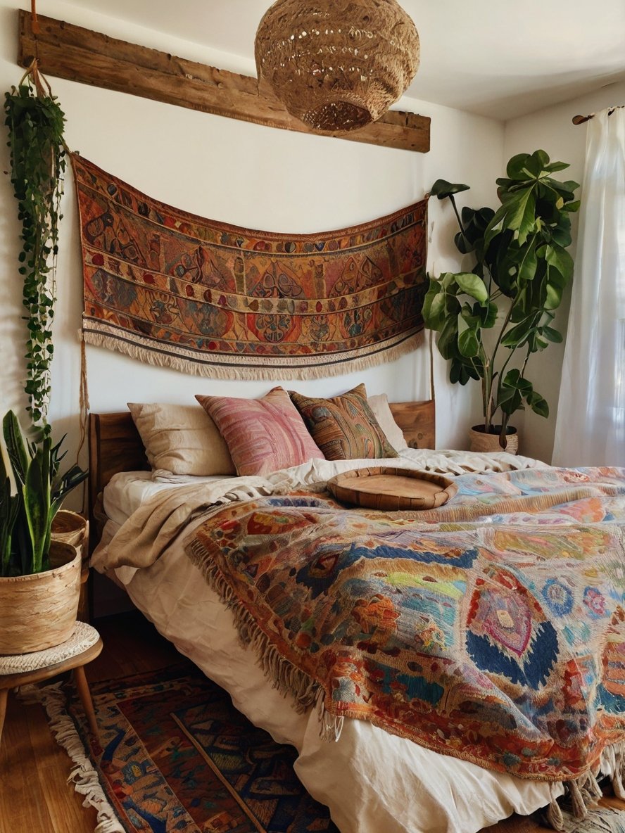 Above the bed, a large, intricately designed wall tapestry serves as a captivating focal point. The warm, earthy hues and traditional patterns reflect global influences, reminiscent of Persian or Moroccan textiles. The way the tapestry is suspended from a rustic wooden beam adds an extra artisanal touch, reinforcing the handmade aesthetic. The slight drape of the fabric gives the room a relaxed and organic feel, while the fringed detailing adds texture. This decor choice brings warmth to the walls and enhances the bedroom’s free-spirited, bohemian vibe.