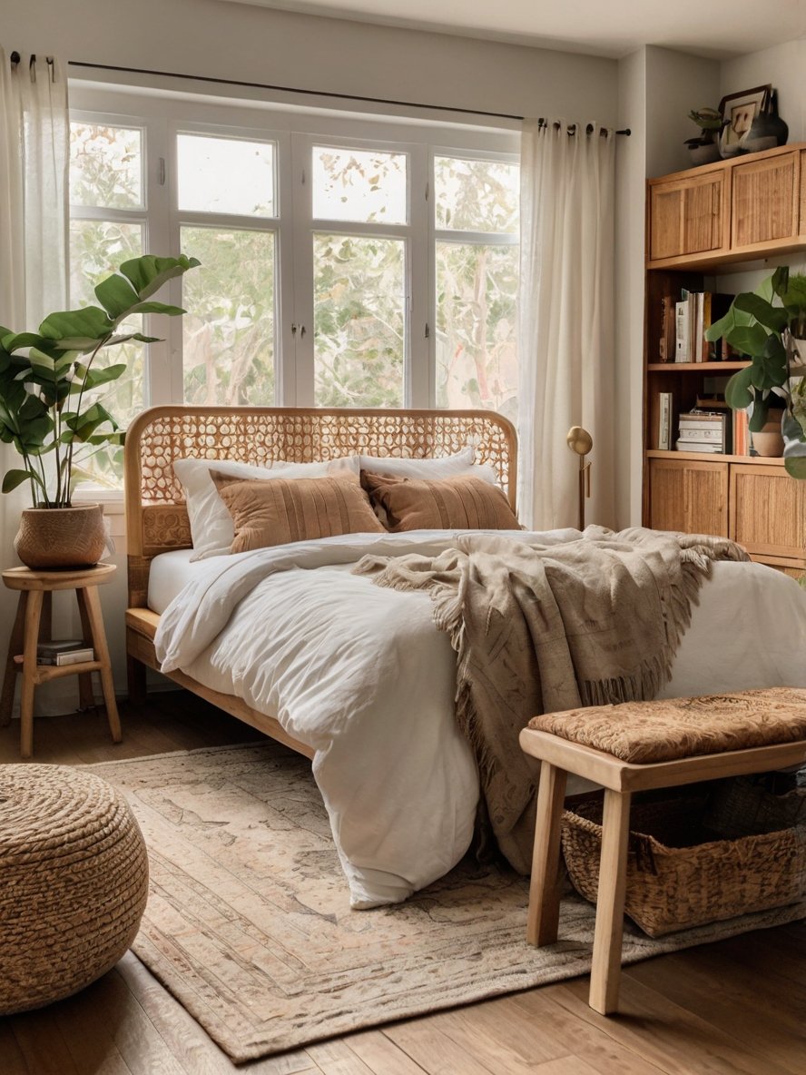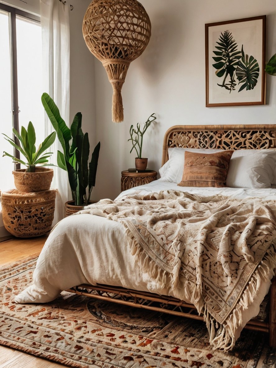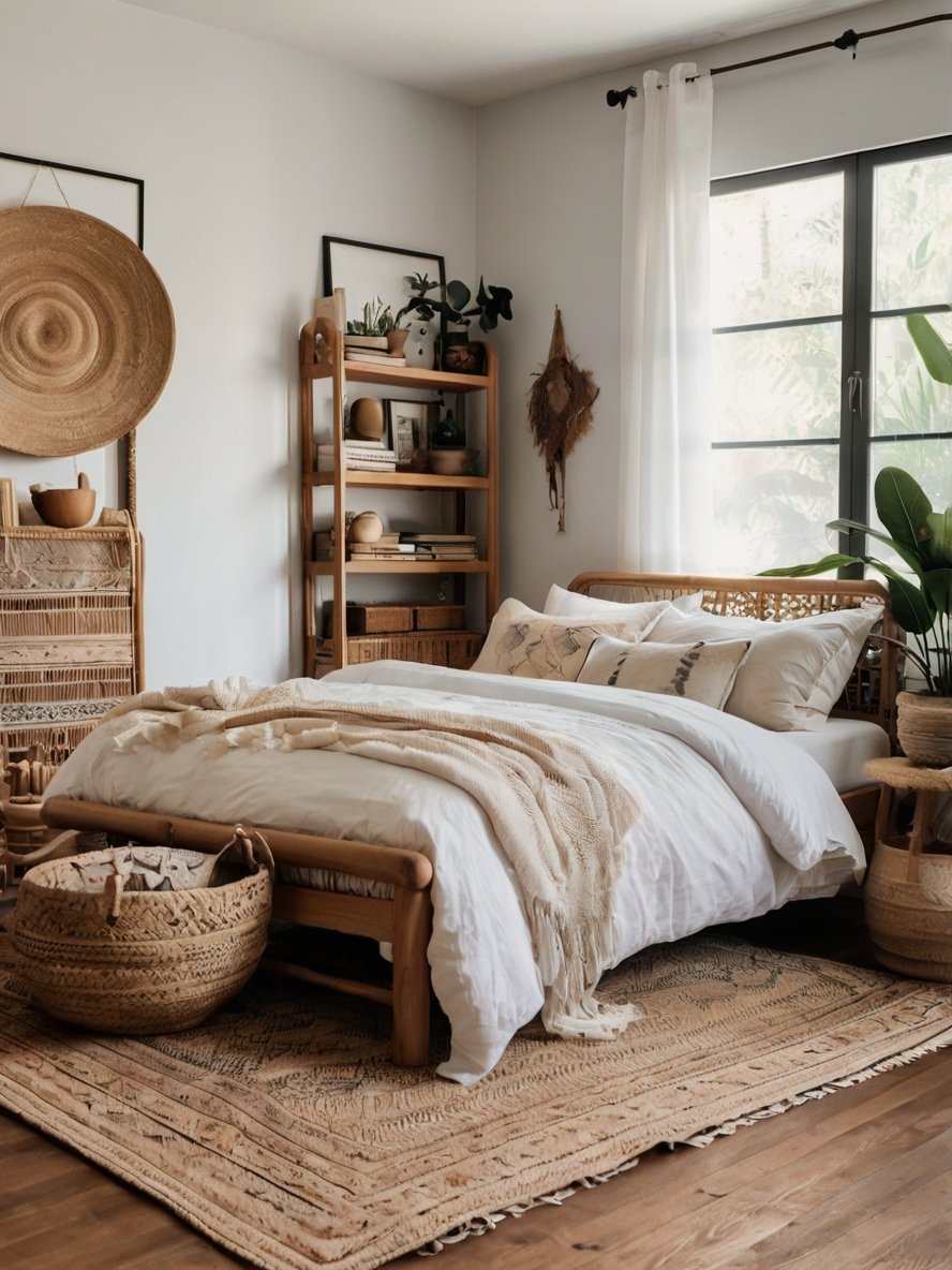 One of the most eye-catching features of this bedroom is its use of rattan and wicker furniture. The bed frame, with its curved rattan headboard, exudes a natural, artisanal charm that aligns perfectly with the boho aesthetic. The bedside table and the shelving unit also incorporate rattan and wicker elements, adding texture and visual interest. The oversized woven basket at the foot of the bed not only serves as stylish decor but also provides functional storage. These natural materials bring warmth to the space and reinforce the connection to nature, which is a key element in bohemian design.
