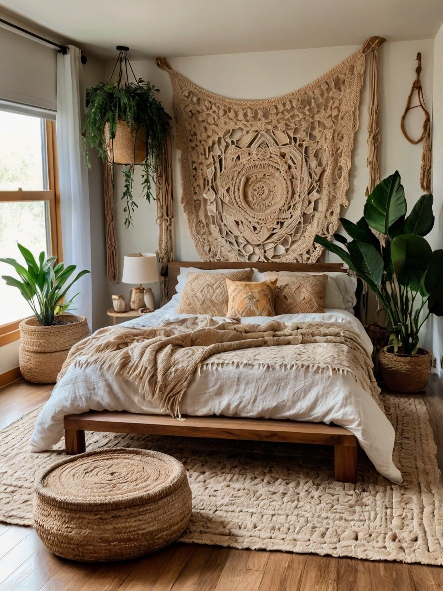 The large macramé wall hanging above the bed serves as the focal point of this room, adding texture, depth, and an artisanal touch. Its intricate detailing and symmetrical design create a sense of balance, while its neutral color keeps the space cohesive. The way it’s draped and secured with knotted rope adds a relaxed, effortless vibe, reinforcing the bohemian aesthetic. This handcrafted piece complements the natural materials throughout the room, making the space feel curated yet organic. The macramé decor sets the tone for the entire design, ensuring a cozy and artistic backdrop for the bed.