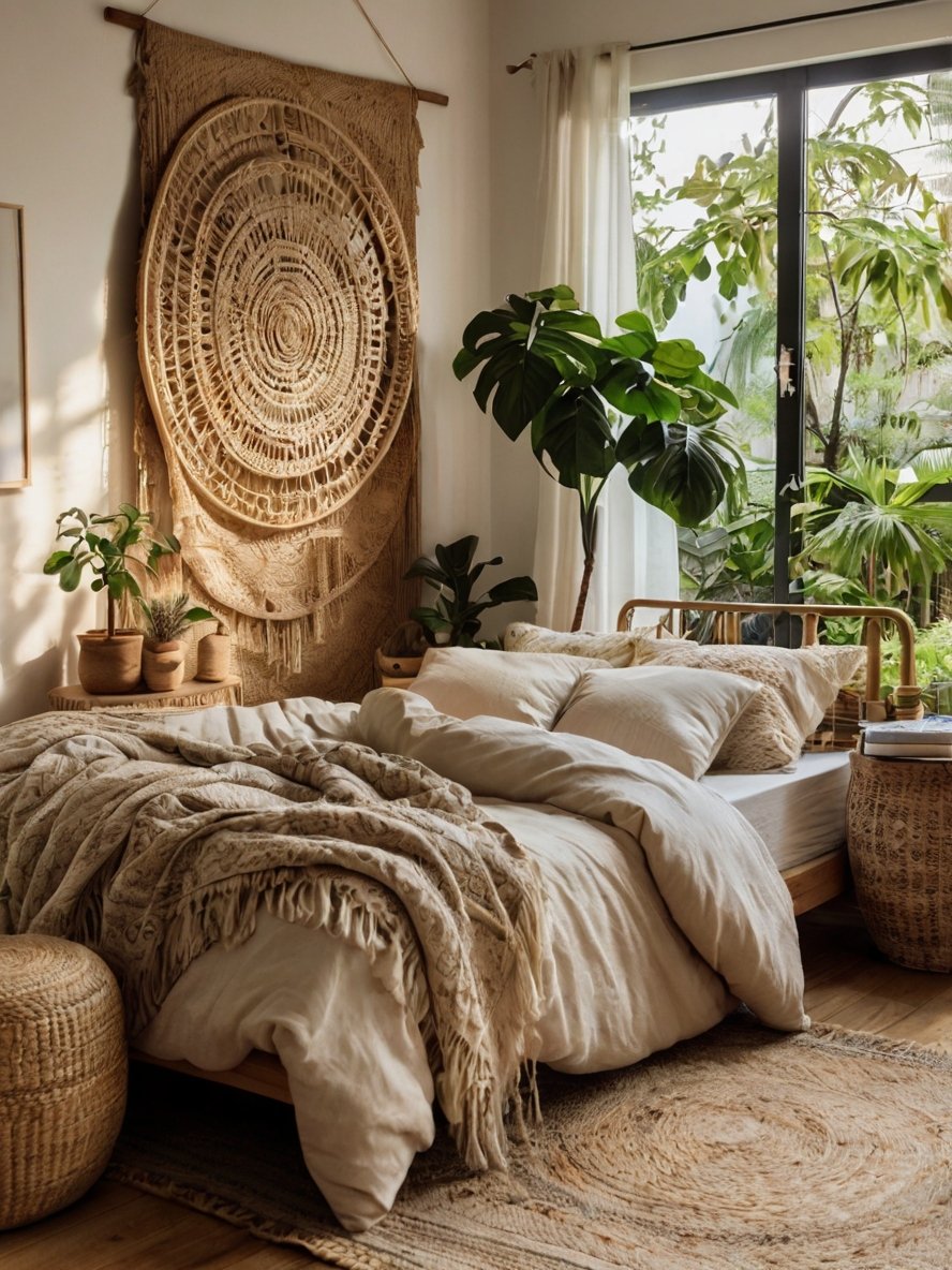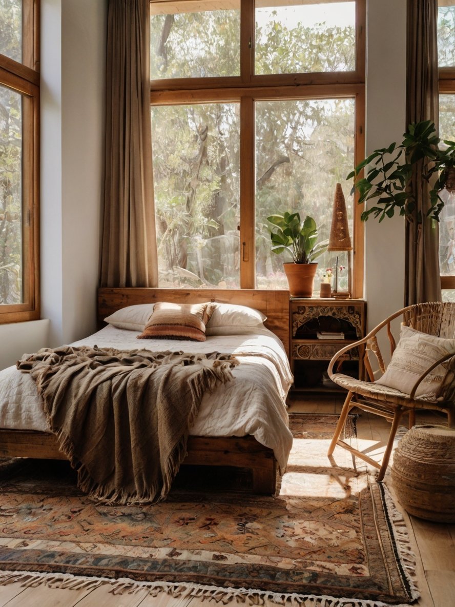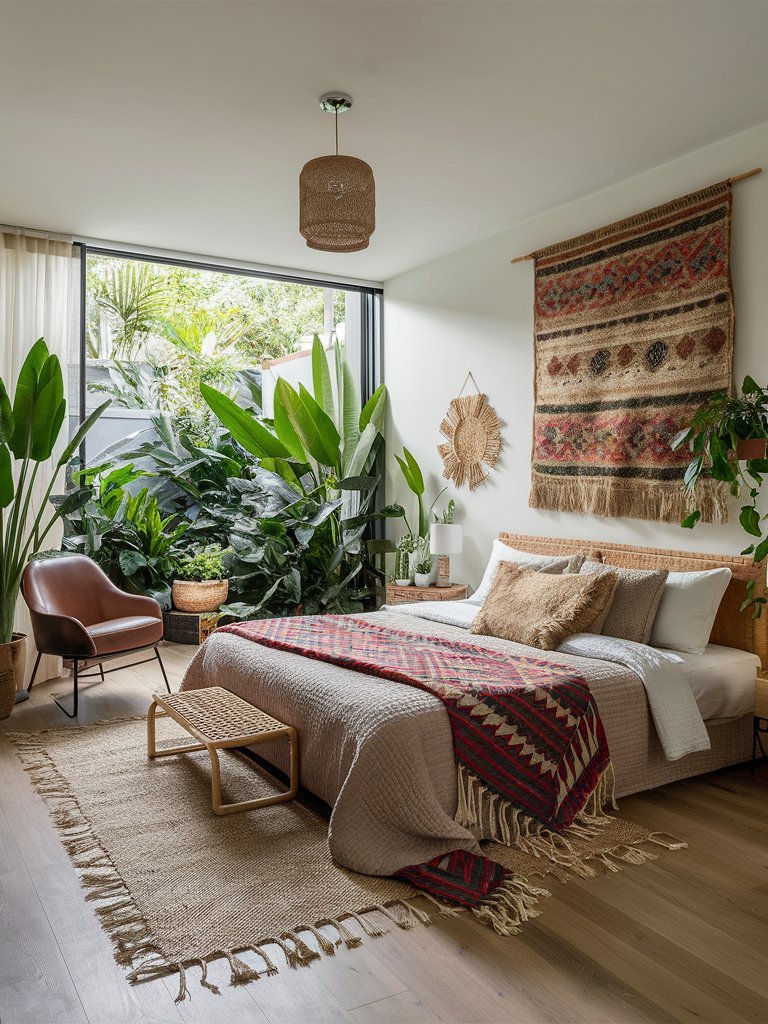 The outdoor greenery visible through the window feels like an extension of the bedroom’s design, seamlessly blending the indoor and outdoor environments. This integration of nature plays a crucial role in bohemian decor, where a strong emphasis is placed on organic materials and elements that evoke a sense of calm and relaxation. The large glass panels also help make the space feel more expansive, giving the bedroom an open and breathable quality.