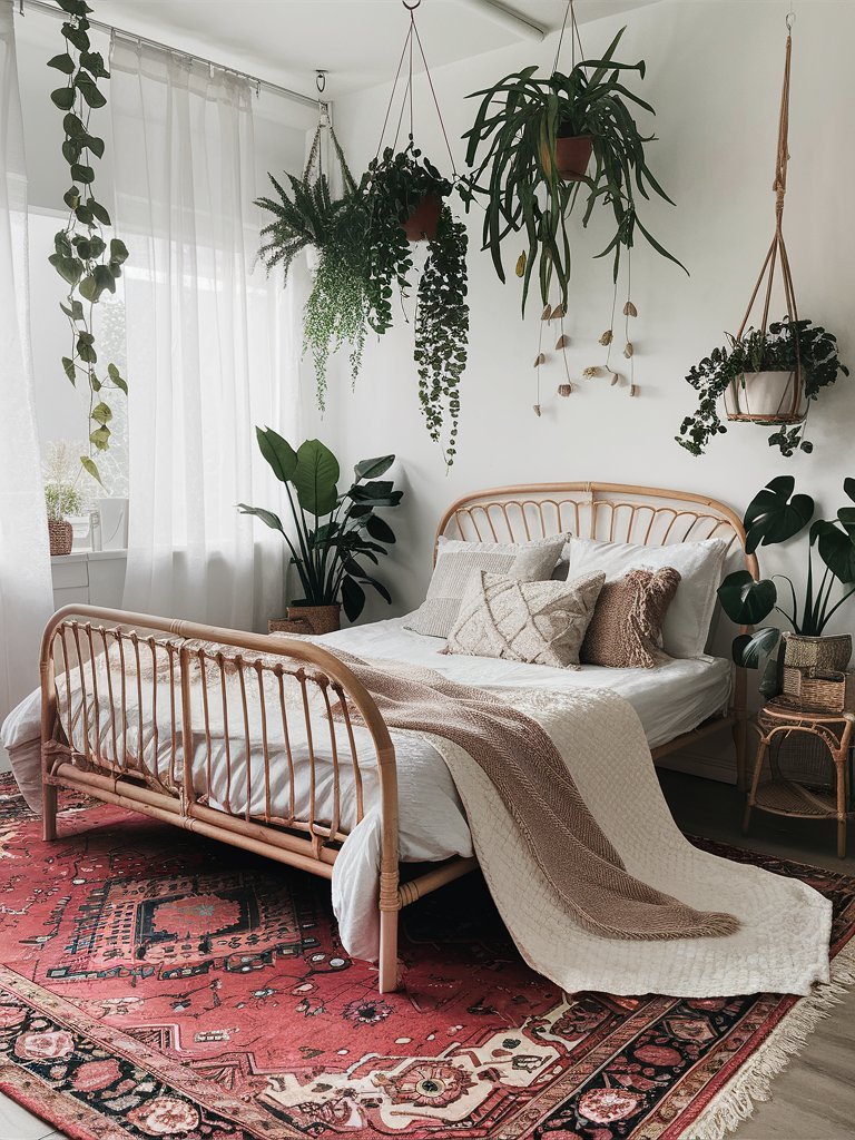 One of the most defining features of this bedroom is the abundance of hanging plants that cascade from the ceiling. The mix of ferns, pothos, and trailing vines creates a lush, jungle-like ambiance that brings life into the space. The hanging planters, suspended with macramé ropes, reinforce the organic and handmade aesthetic, ensuring that nature is a central part of the room’s design.
