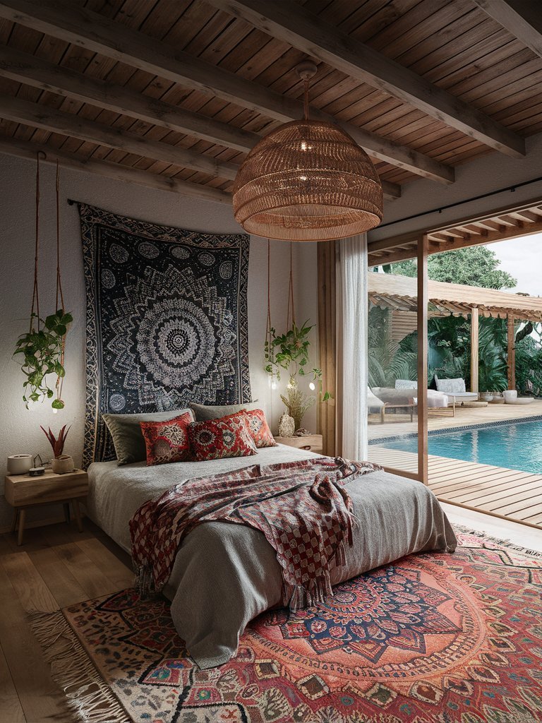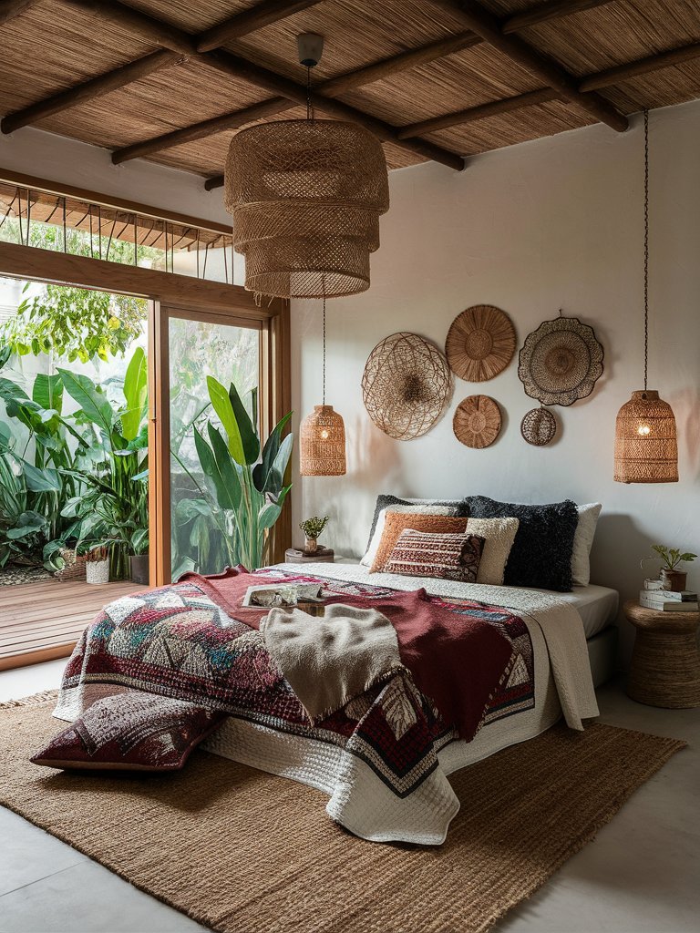 The use of natural materials in the ceiling design connects the space to tropical, nature-inspired decor, reminiscent of island resorts or rustic retreats. This feature ensures that the bedroom feels intimate and grounded, reinforcing the bohemian principle of incorporating handmade, artisanal elements. The dark wood beams contrast beautifully with the woven texture, adding depth and dimension to the ceiling while maintaining a light, airy feel.