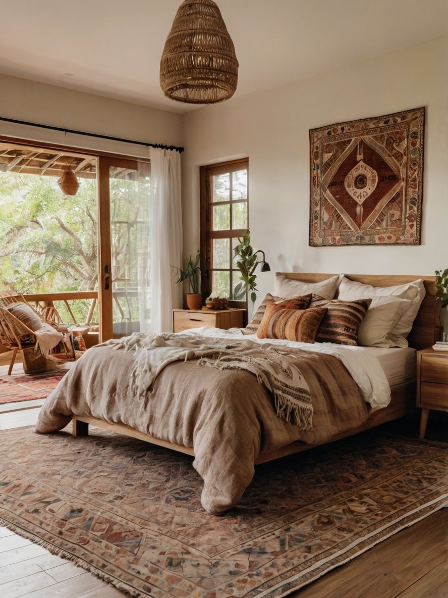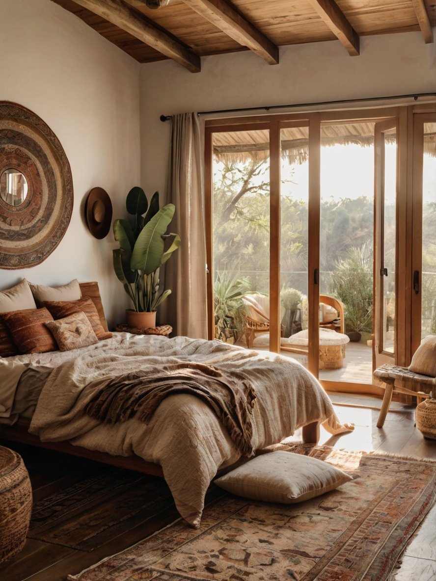 The color palette of this bedroom is deeply rooted in nature, featuring warm browns, muted beiges, and terracotta tones. These hues create a cozy, grounded atmosphere, making the space feel welcoming and serene. The mix of soft neutrals and rich, earthy colors adds depth without feeling overwhelming. The layering of warm textiles further enhances the color scheme, adding a sense of softness and relaxation. The natural light filtering through the wooden-framed doors enhances these hues, giving the space an inviting, golden glow. This color scheme aligns perfectly with the bohemian aesthetic, emphasizing warmth, comfort, and a connection to nature.