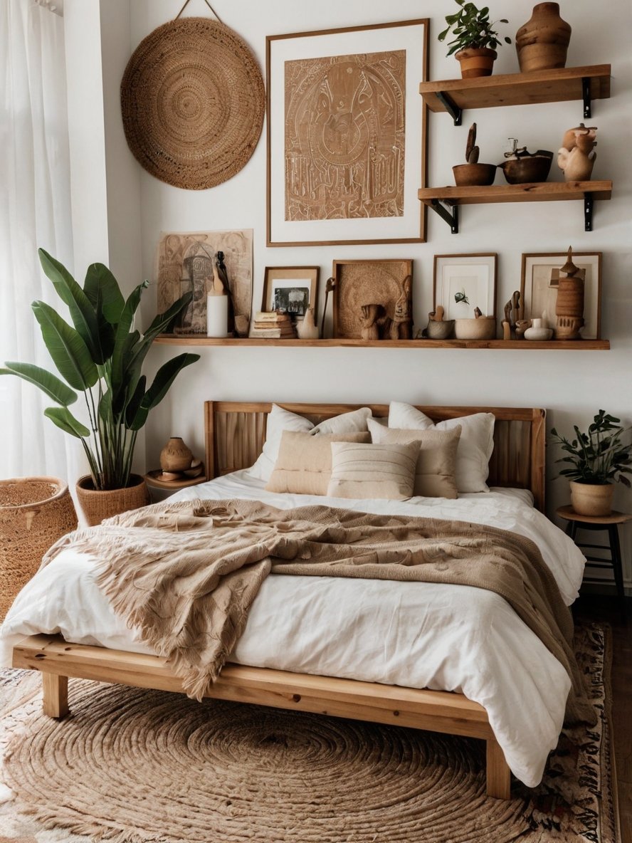 The wooden floating shelves above the bed are a standout feature in this room, displaying an array of curated decor pieces that add character and warmth. The carefully arranged pottery, framed artwork, and small sculptural elements reflect a love for handcrafted, artisanal objects, reinforcing the boho aesthetic.