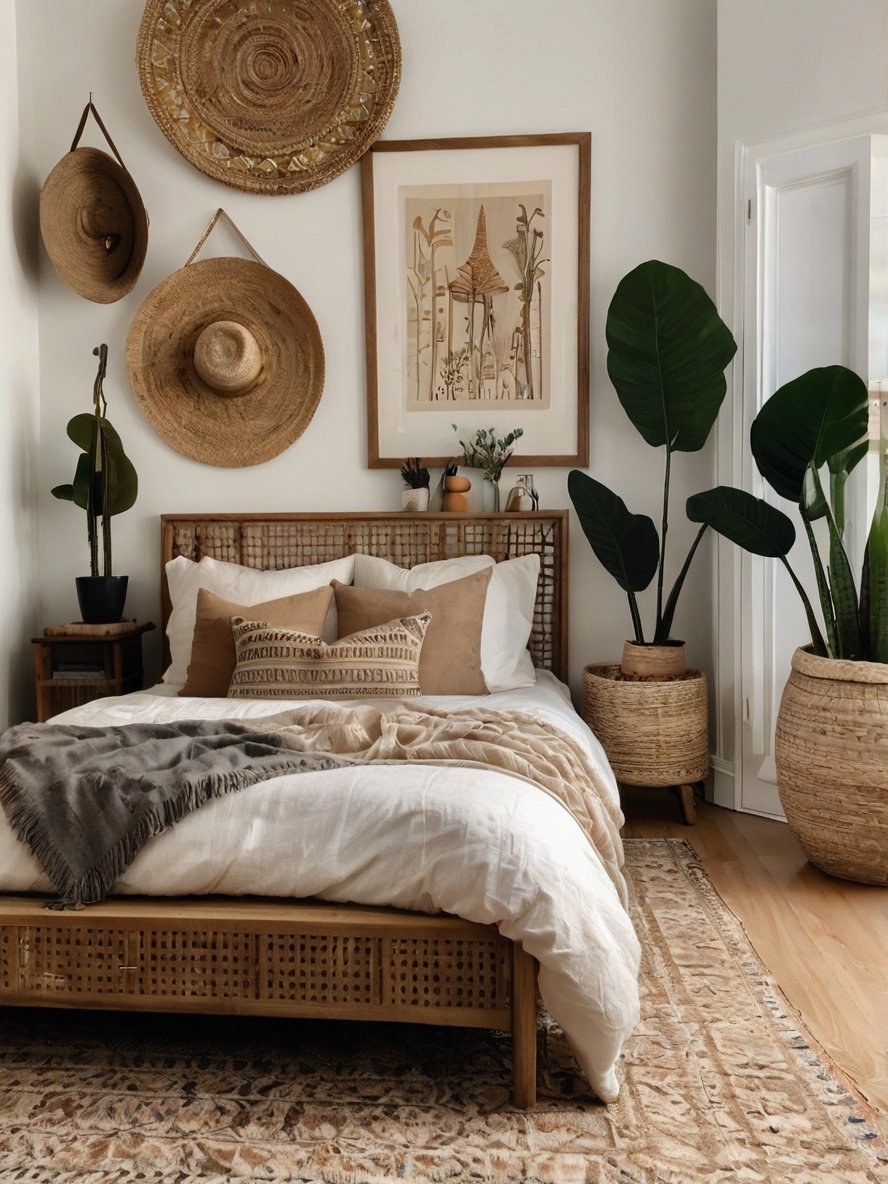 The woven wall decor pieces hanging above the bed add a sense of artistry and cultural depth to the space. The mix of different woven baskets and straw hats creates an eclectic yet harmonious composition, reinforcing the bohemian love for handcrafted elements. The varied shapes and sizes add movement to the wall, ensuring that it feels dynamic rather than static.