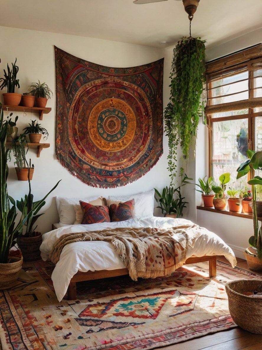 The combination of layered rugs beneath the bed adds depth and personality to the space. The vintage-inspired area rug features intricate tribal patterns and warm, earthy tones that echo the hues found in the wall tapestry and throw pillows. The layered effect enhances the cozy atmosphere while showcasing the beauty of handcrafted textiles.