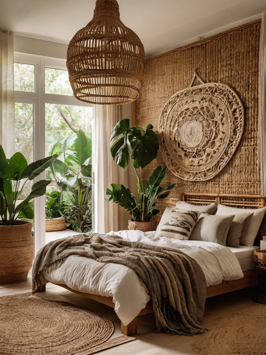 What makes this bedroom truly exceptional is its seamless balance of organic materials, handcrafted decor, and layered textures. Every element, from the wooden furniture to the woven textiles and indoor greenery, contributes to a harmonious and inviting space.